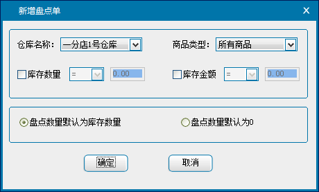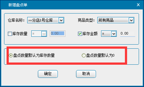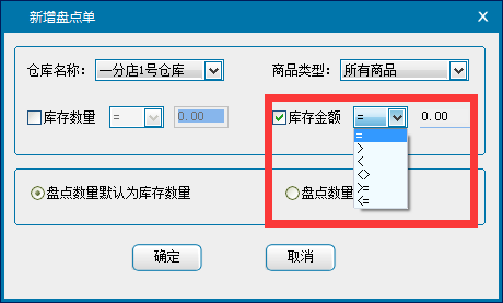 可以选择库存金额等于、大于、小于、不等于某个指定金额的商品进行盘点