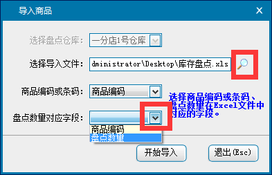 点击“放大镜”图标选择完善好的盘点文件,点击下箭头选择对应字段,然后开始导入