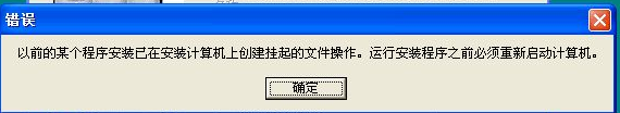 5、 安装过程中可能会出现意外情况,如下图,请重启电脑手工清除注册表,清除注册表方法:点击 开始 运行 输入:regedit 打开注册表找到如下目录HKEY_LOCAL_MACHINESYSTEMCurrentControlSetControlSession Manager删除PendingFileRenameOperations。