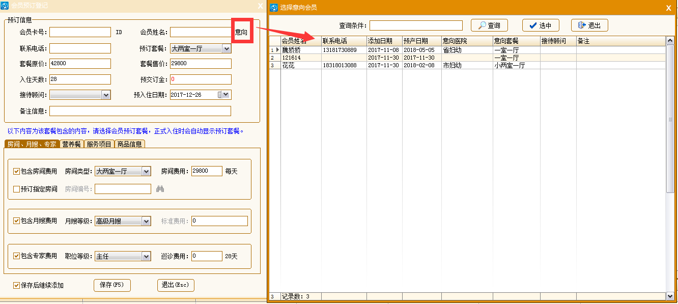 预订会员:登记会员预订的套餐、定金、房型、月嫂等其他项目,也可以直接把意向会员转为预订会员。