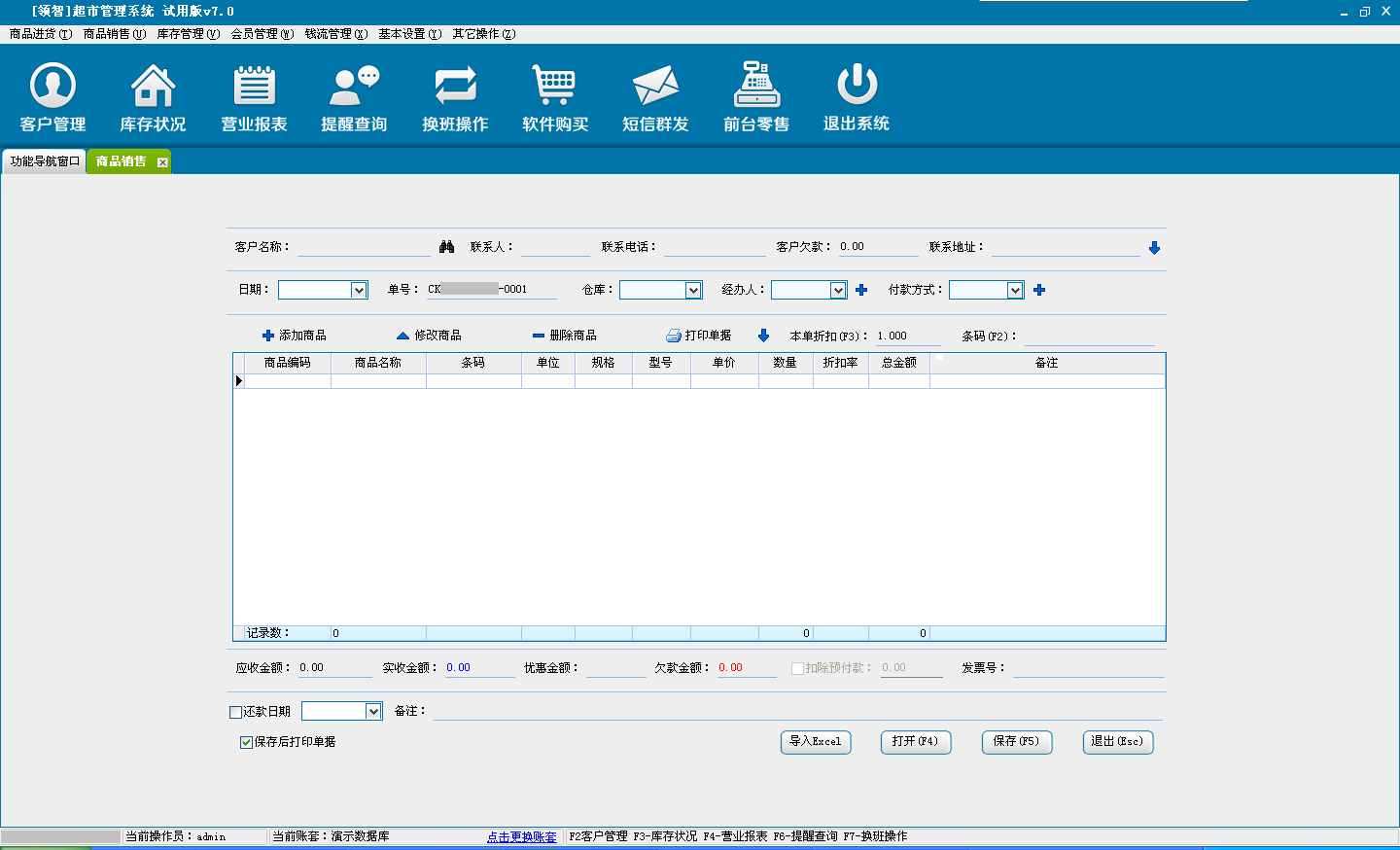 打开领智超市POS销售程序,或者点击后台管理系统“前台零售”按钮进入POS销售主界面,用于商品的零售操作。可以根据右侧的快捷键帮助列表执行各种操作。