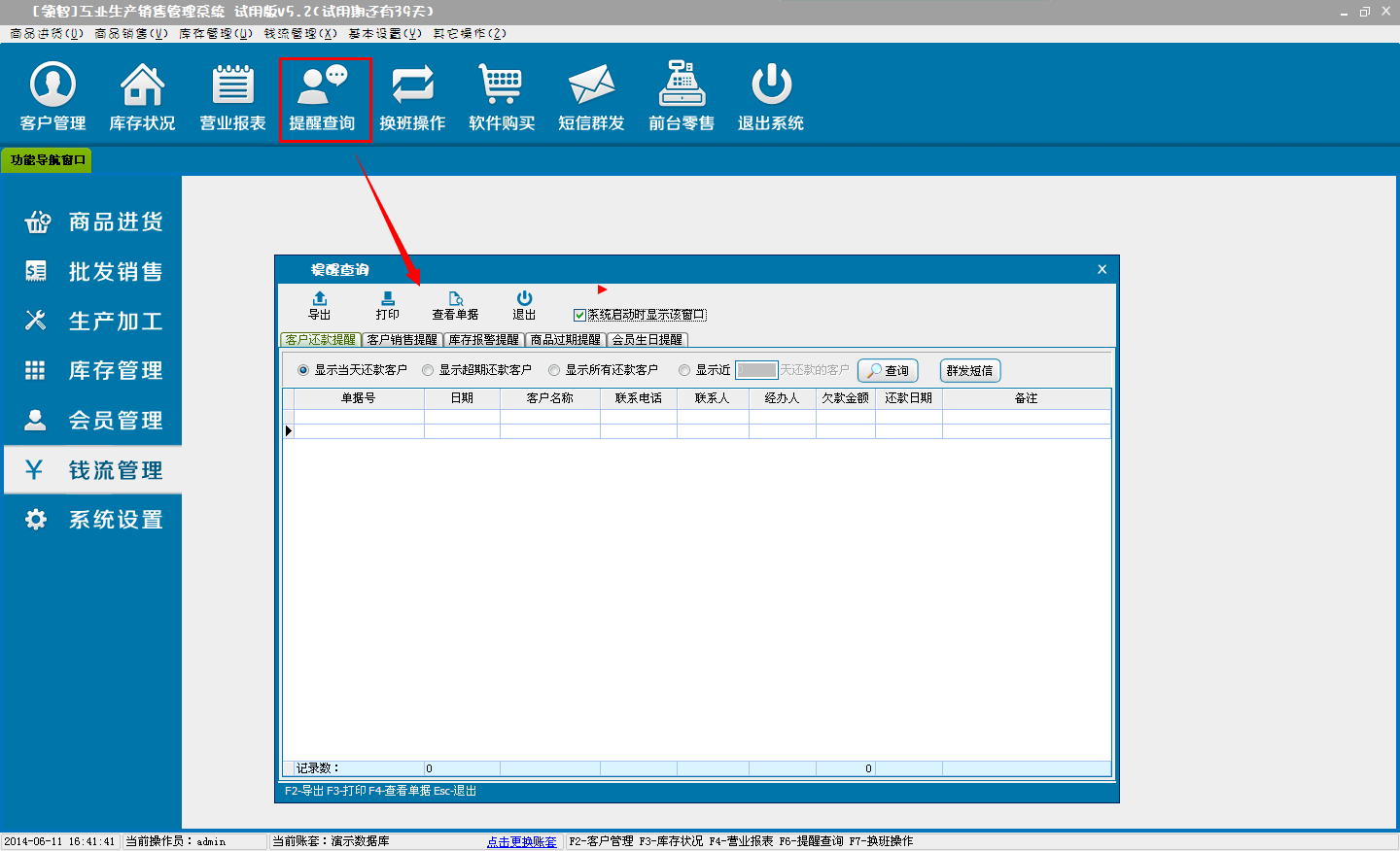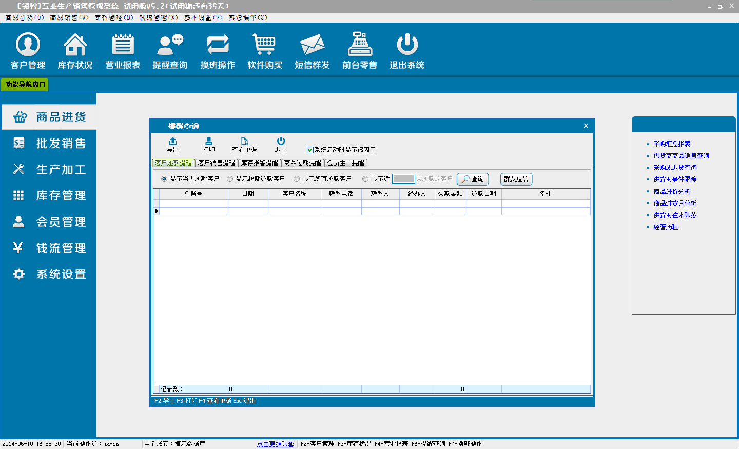 对一些重要信息的查询,可以设置在软件运行启动后显示该提醒窗口。包含客户还款提醒、库存报警提醒、客户销售提醒和会员生日提醒。
