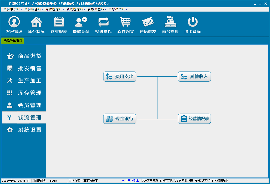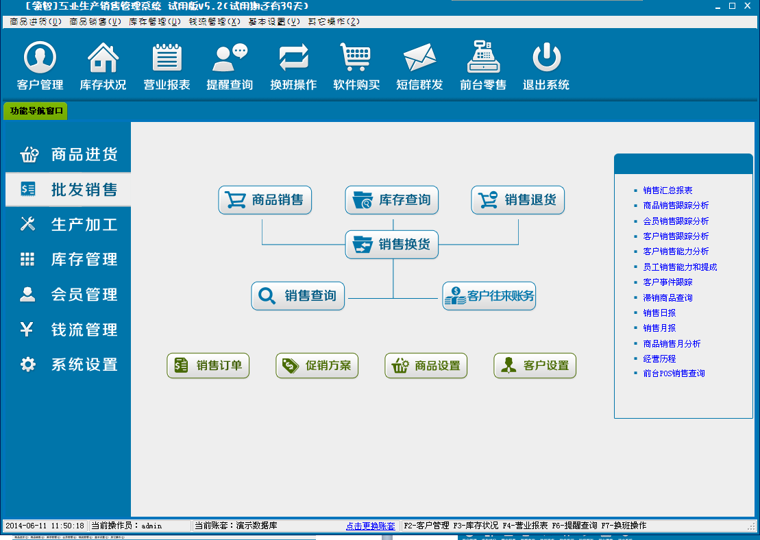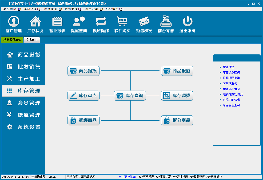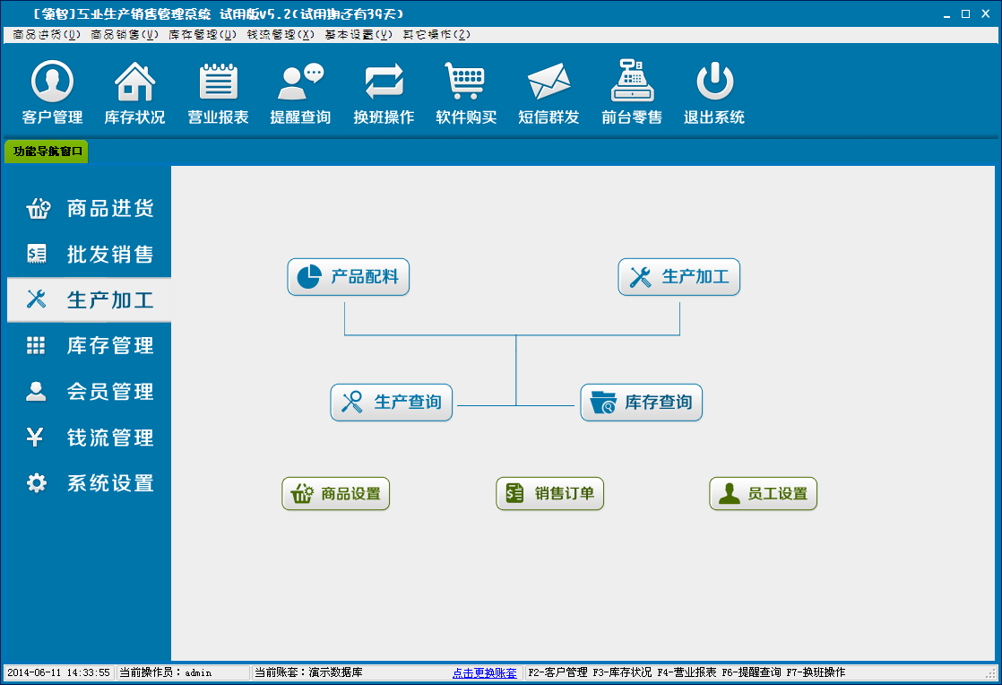 领智软件包含商品进货、批发销售、生产加工、库存管理、会员管理、钱流管理、系统设置几个主要功能模块。