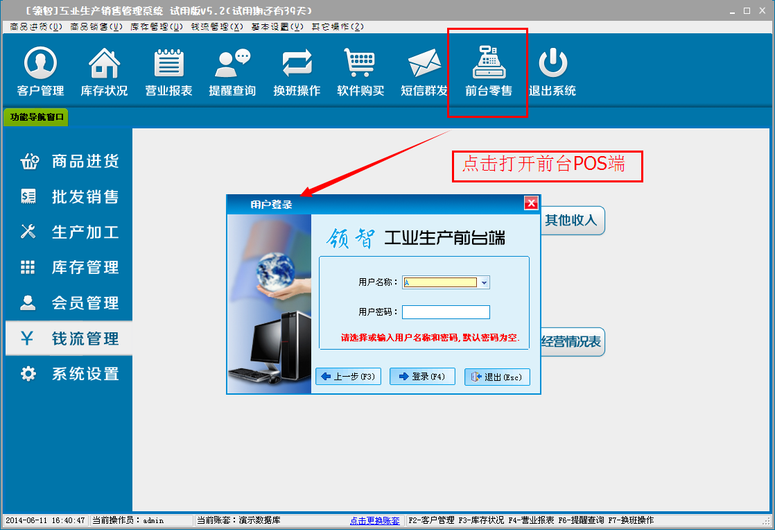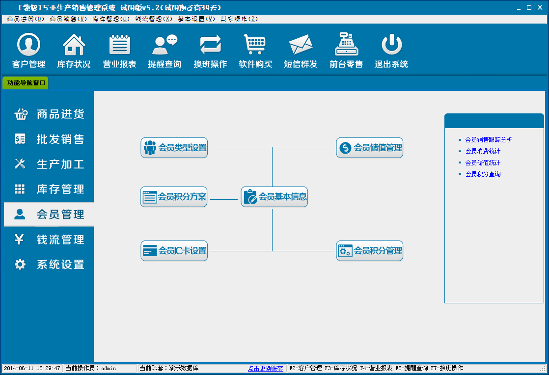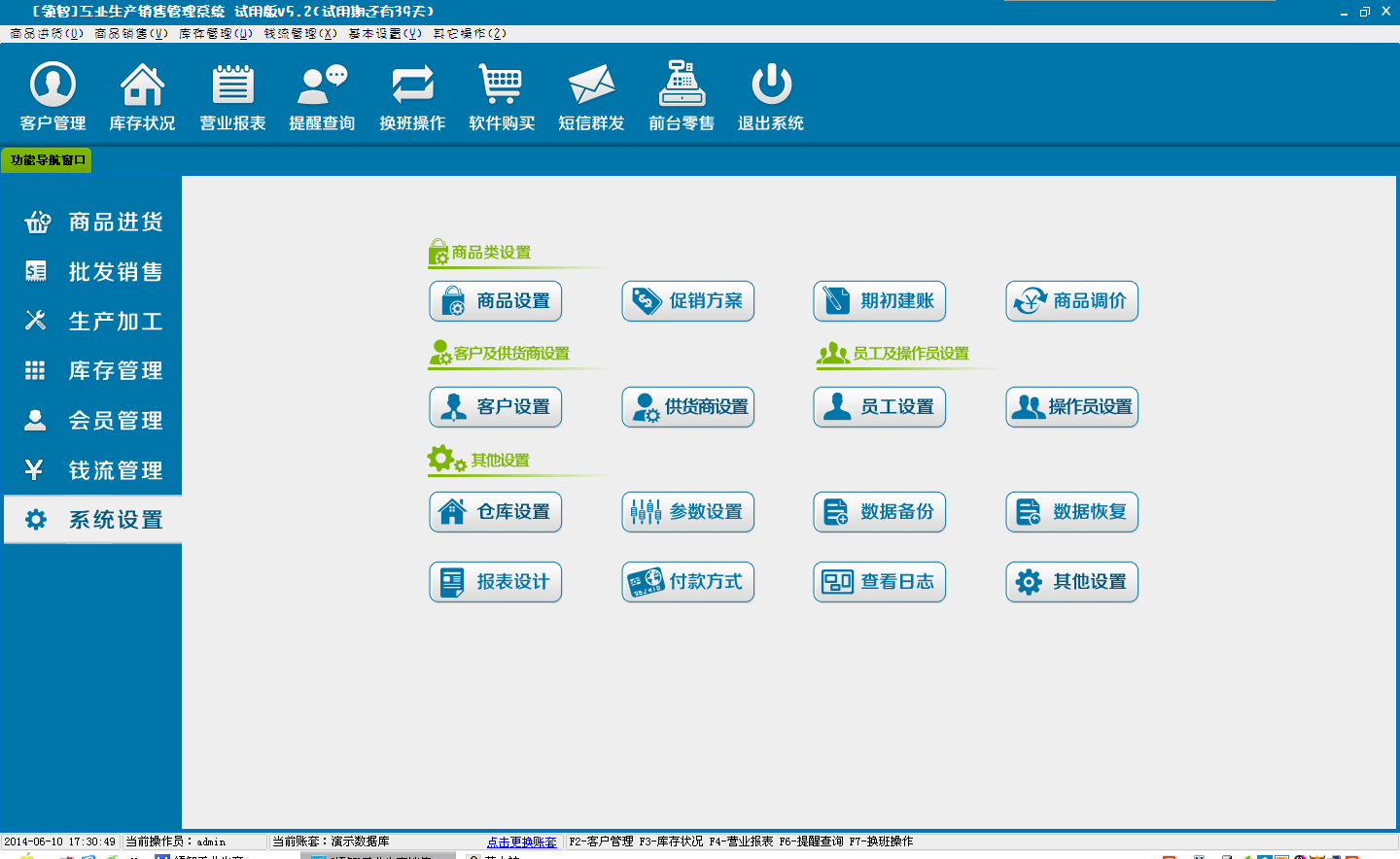 领智软件包含商品进货、批发销售、生产加工、库存管理、会员管理、钱流管理、系统设置几个主要功能模块。