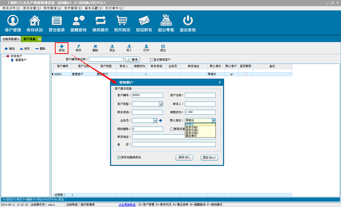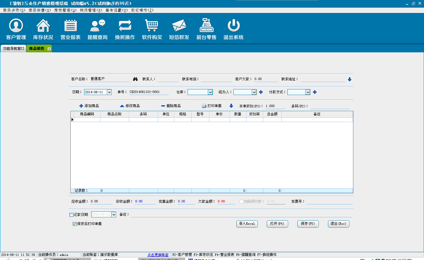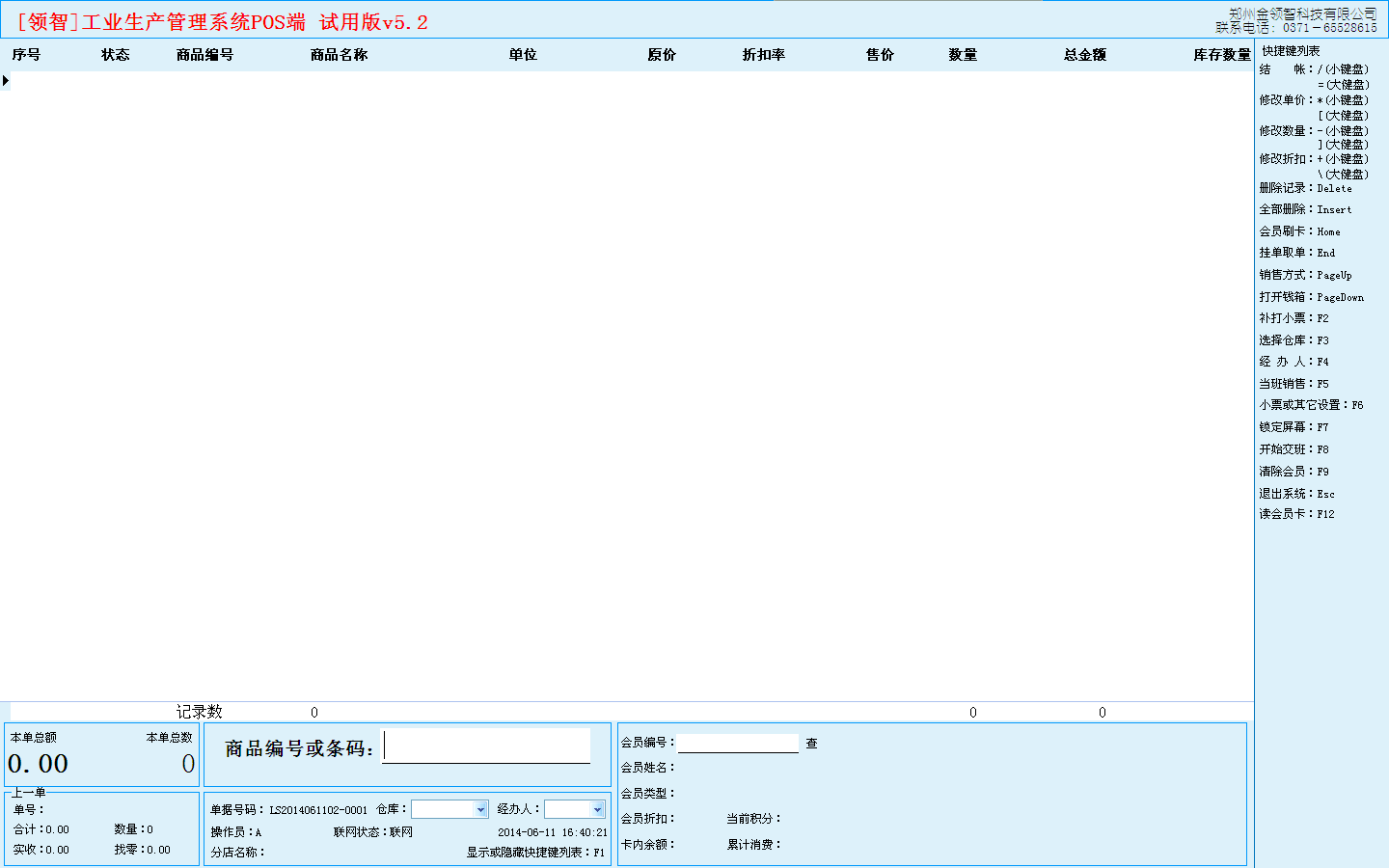 打开领智工业生产销售POS销售程序,或者点击后台管理系统“前台零售”按钮进入POS销售主界面,用于商品的零售操作。可以根据右侧的快捷键帮助列表执行各种操作。