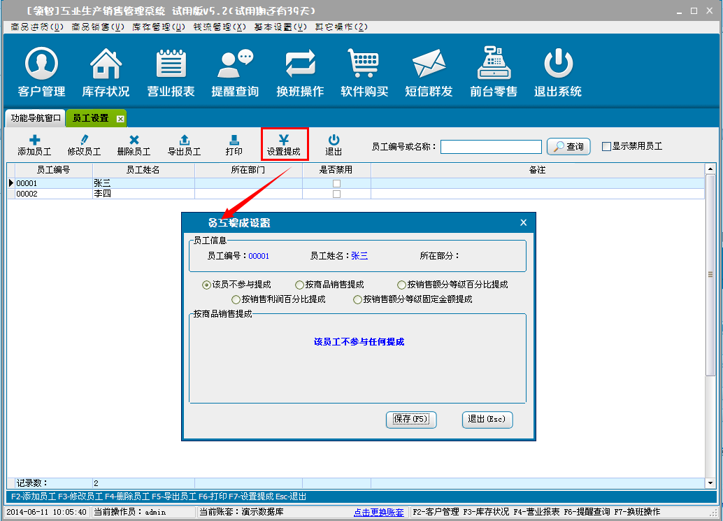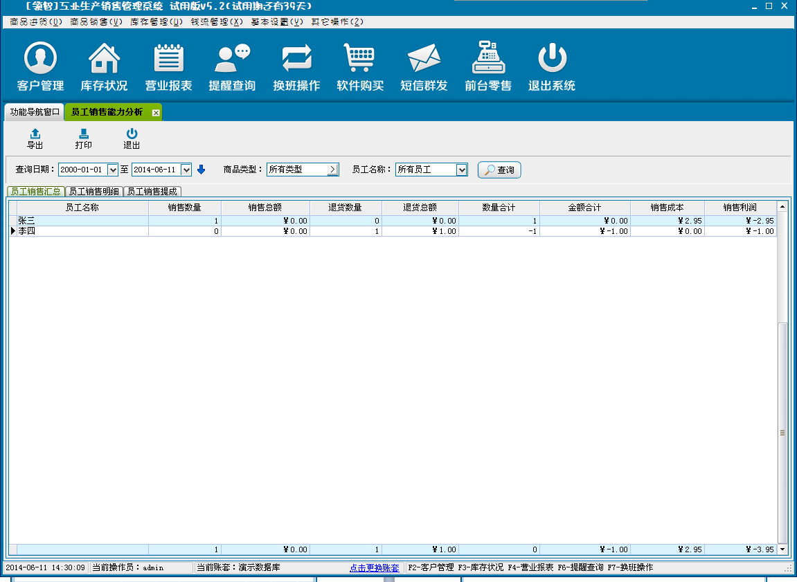 员工销售业绩和提成的统计。需要设置员工提成方案和商品提成方案,产生商品销售操作后该功能才有效。