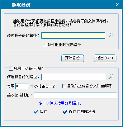 用于对本程序数据库的备份,建议用户养成备份数据库的好习惯,以免种种原因造成数据丢失能够及时找回历史数据,避免造成不必要的损失。建议启用软件自动备份功能,定时对软件数据库自动进行备份。