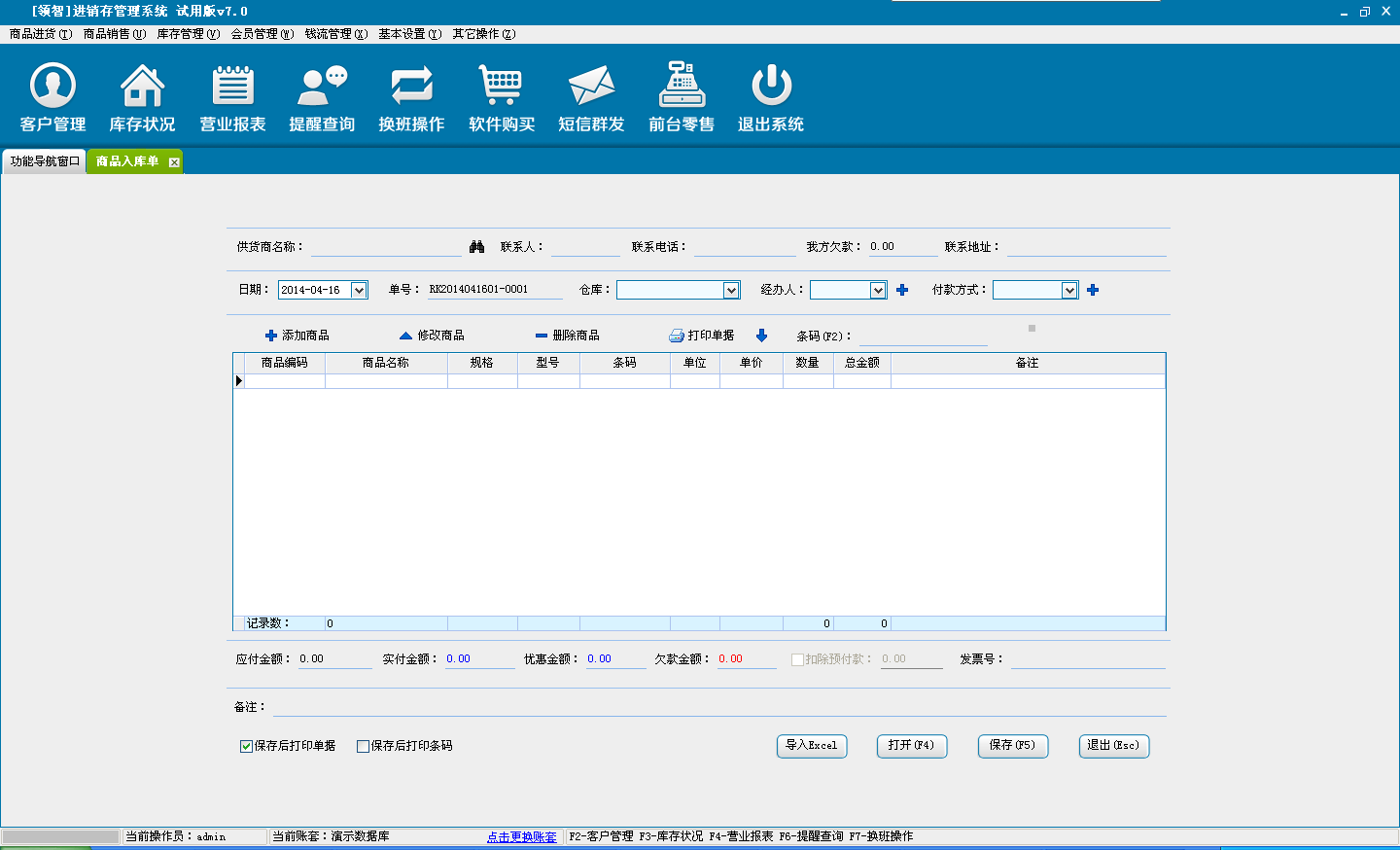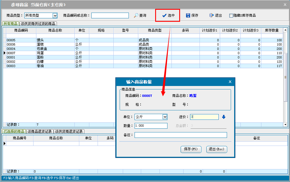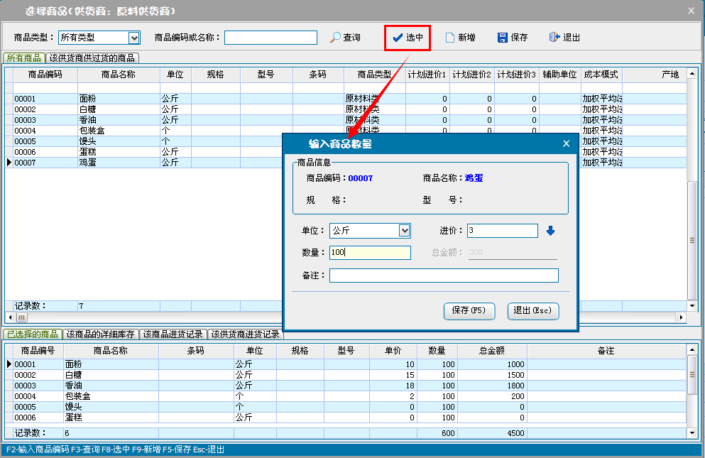 单击添加商品,进入选择商品窗口,添加采购商品信息。设置商品的采购价格,数量和折扣率,单击保存退出,返回采购进货界面。也可以单击导入excel通过excel文档导入采购的商品信息。