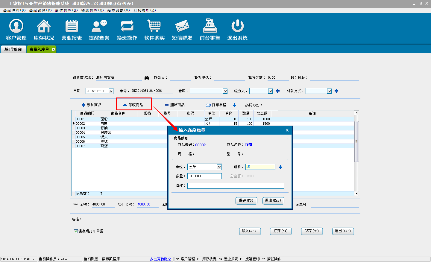 b:核对采购商品信息.可对添加的商品直接修改数量、单价。