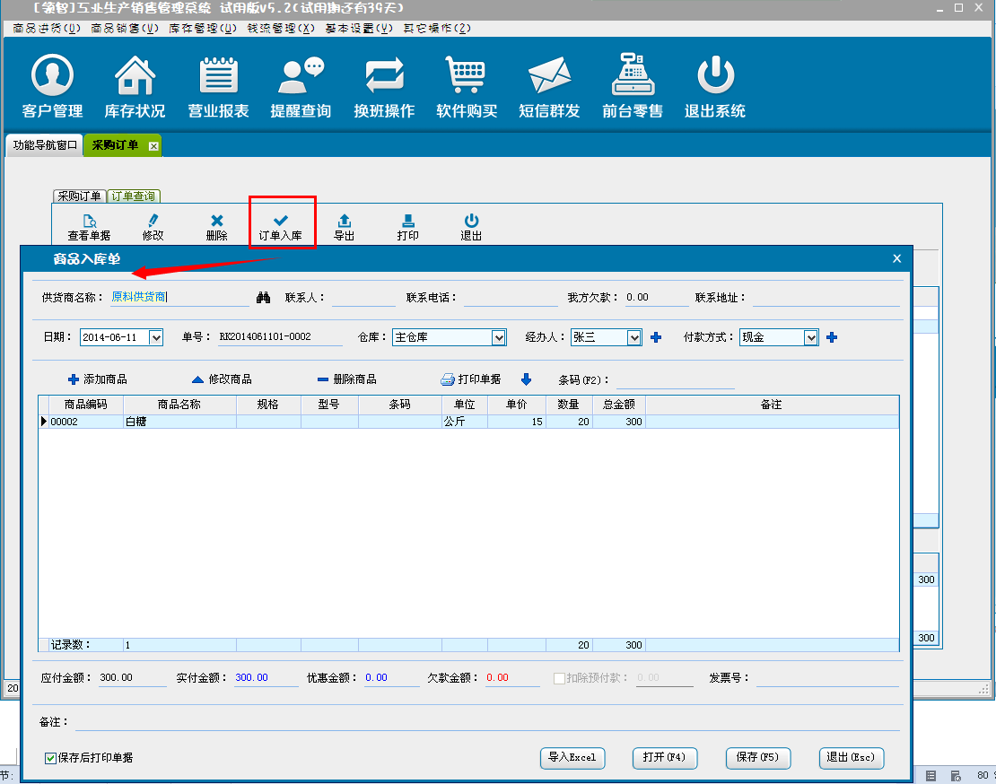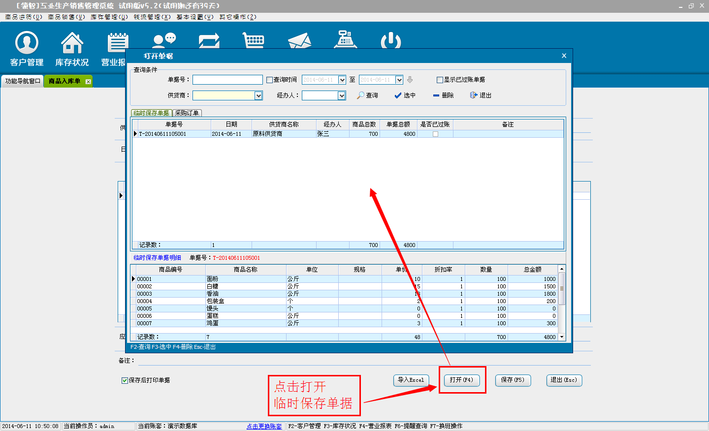 d:选择临时保存,单击确定后,单据将保存为临时采购进货单,不会对商品的库存和财务信息产生影响。临时单据可以在商品入库单“打开”按钮,在打开单据选择临时保存单据进行打开。