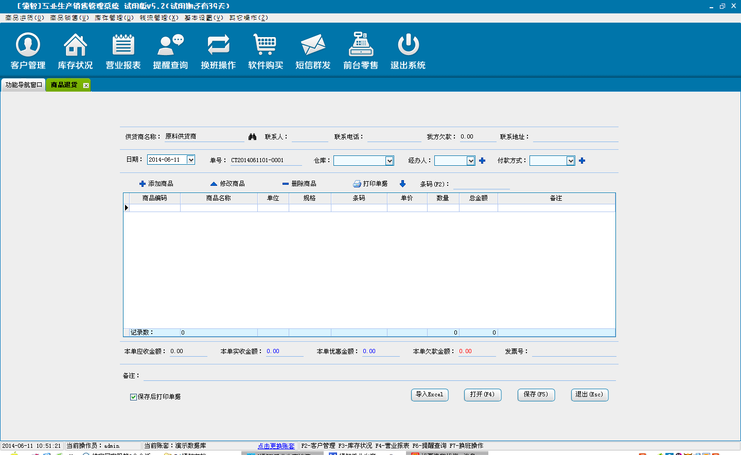 单击添加商品,进入选择商品窗口,添加退货商品信息。设置商品的单价,数量和折扣率,单击保存退出,返回商品退货界面。也可以通过excel文档导入退货的商品信息。