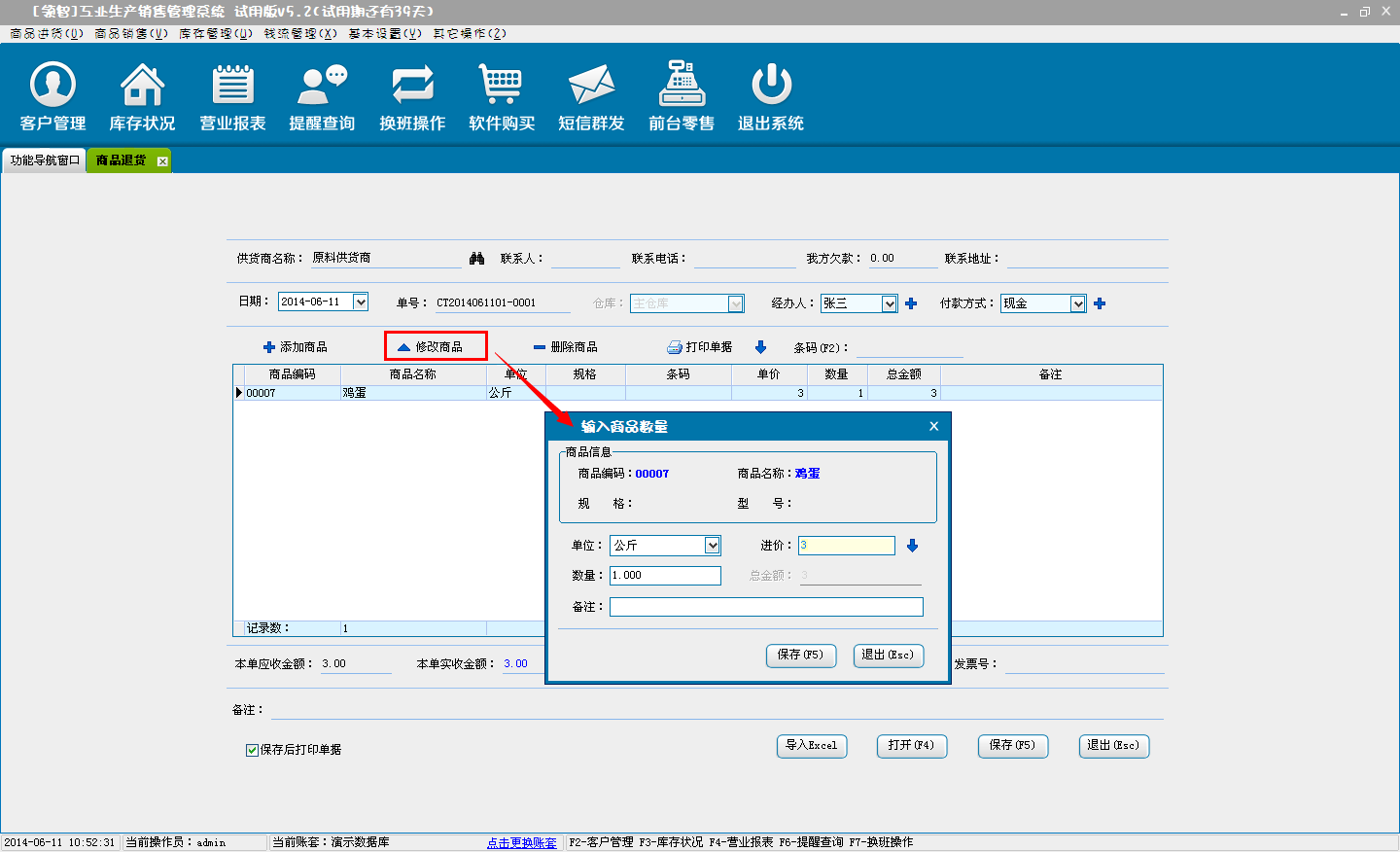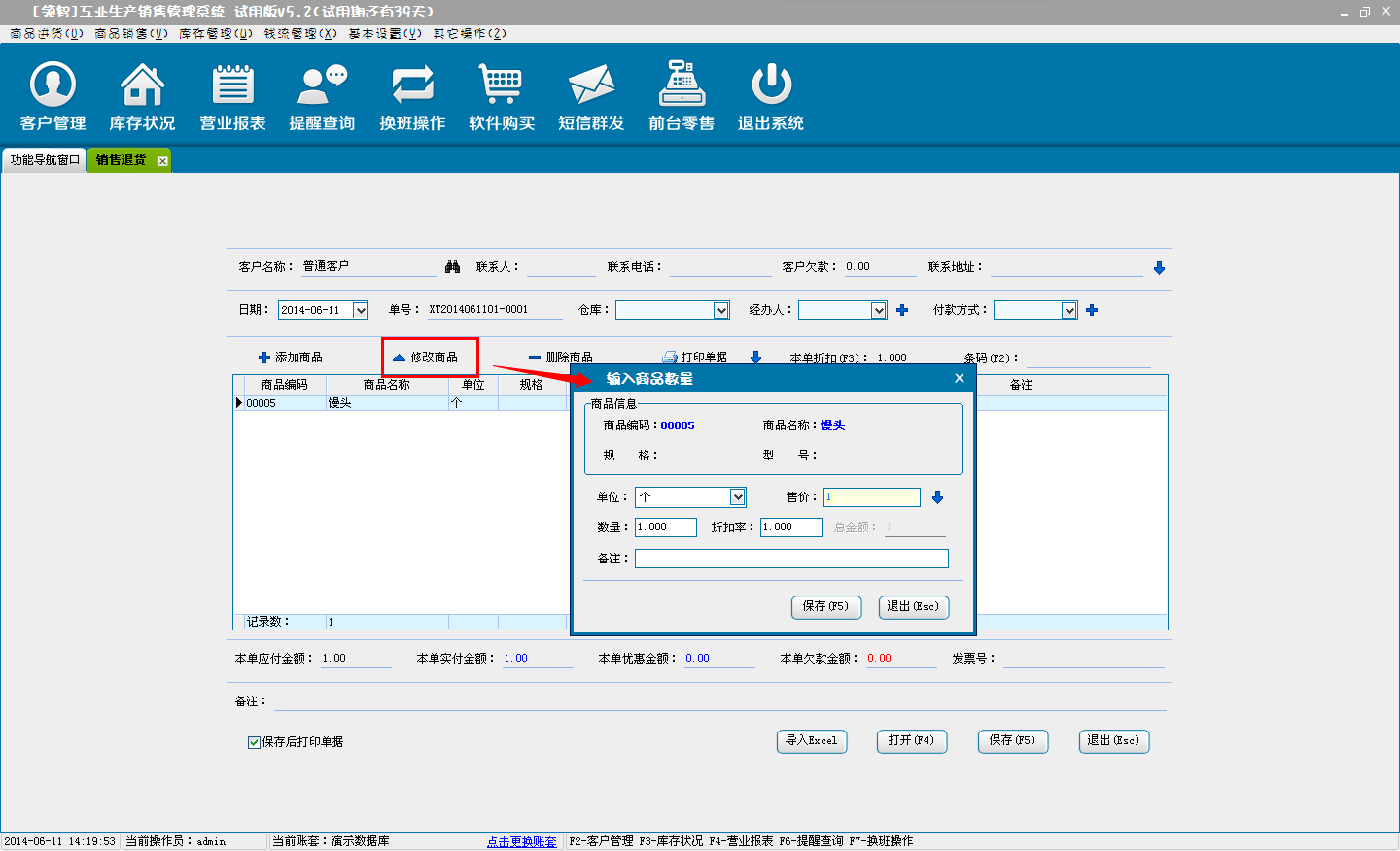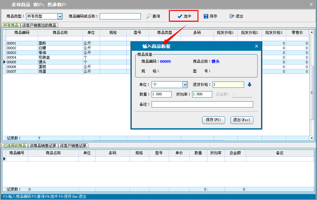 b:核对退货商品信息,可对添加的商品直接修改数量、单价和折扣率(折扣率为大于0小于等于1的小数,0.8即8折)。