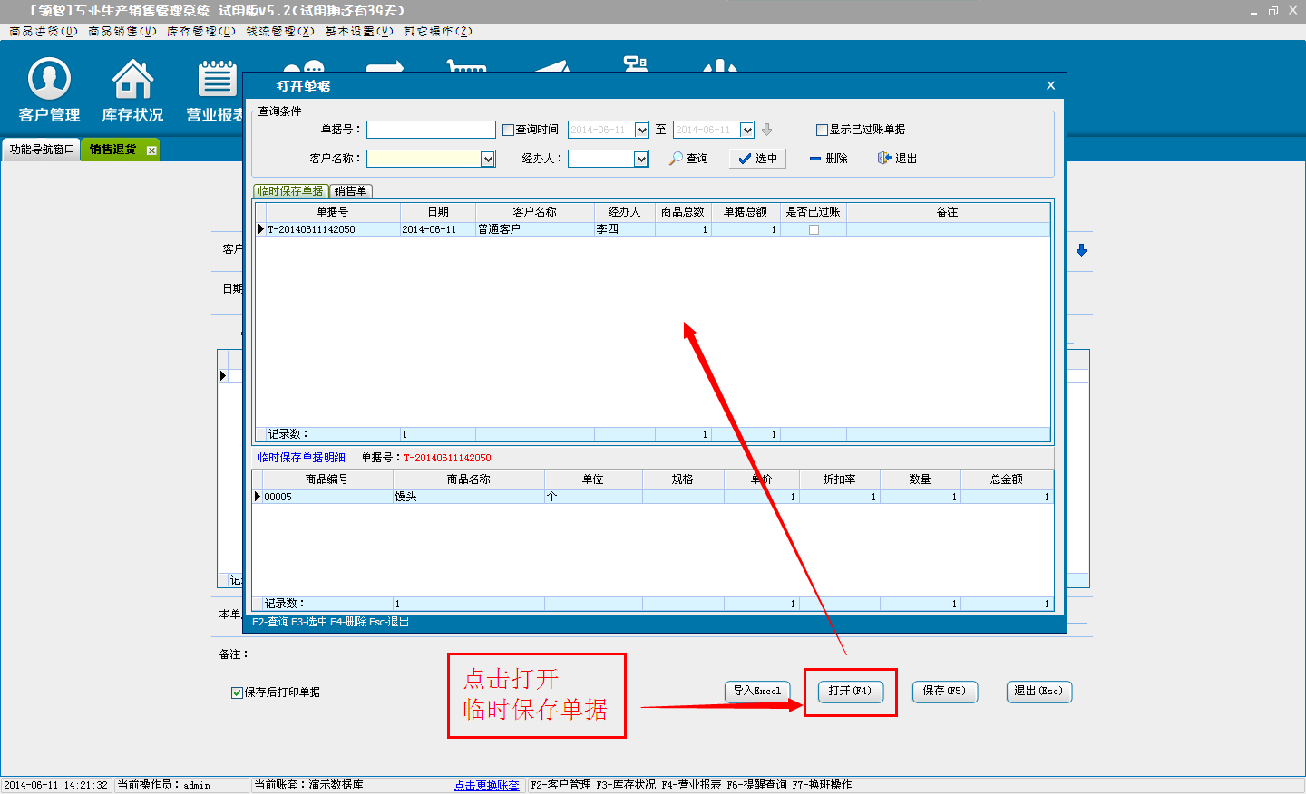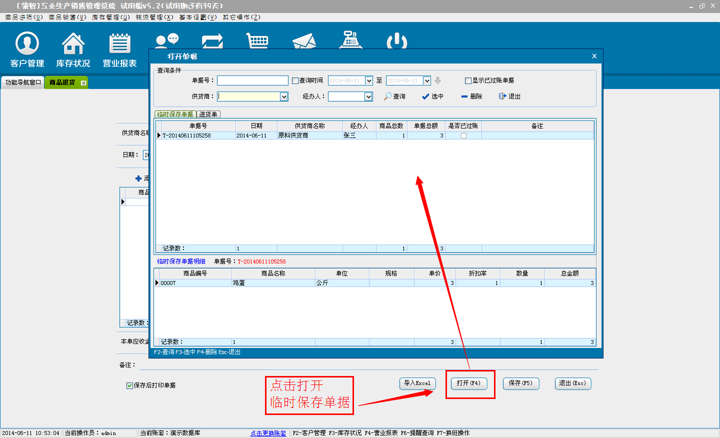 d:选择临时保存,单击确定后,单据将保存为临时商品退货单,不会对商品的库存和财务信息产生影响。临时单据可以在商品退货窗口单击打开按钮,在打开单据中选择临时保存单据进行打开。