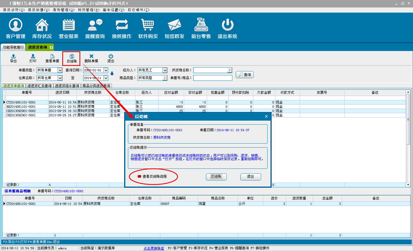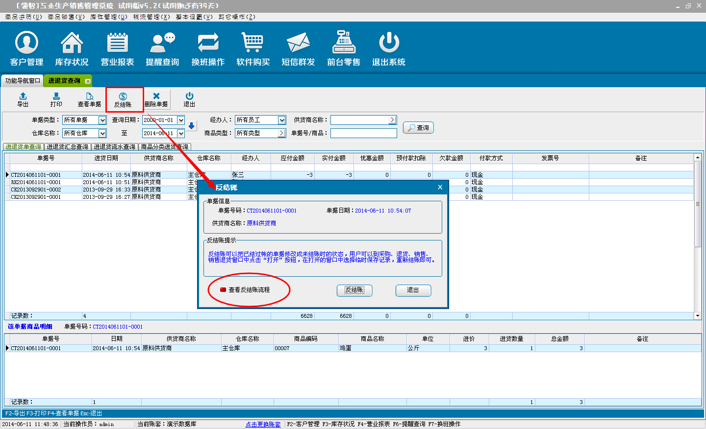 用于查询商品的采购进货、退货单据、商品进退货明细的汇总。包括进退货流水查询和进退货按商品类别汇总统计。选择单据,单击查看单据可查询该单据的商品明细信息。单击反结账对该单据进行反结账操作(反结账后的单据可在商品采购进货或退货窗口中,通过打开单据打开并进行再次结账处理)。