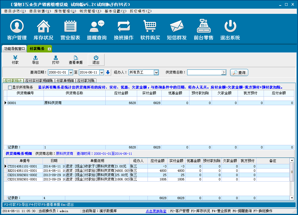 供货商往来账务是对应付款统计、应付实付款明细账、付款单明细、应付款对账的统计分析。并选择单据进行付款、导出和打印。