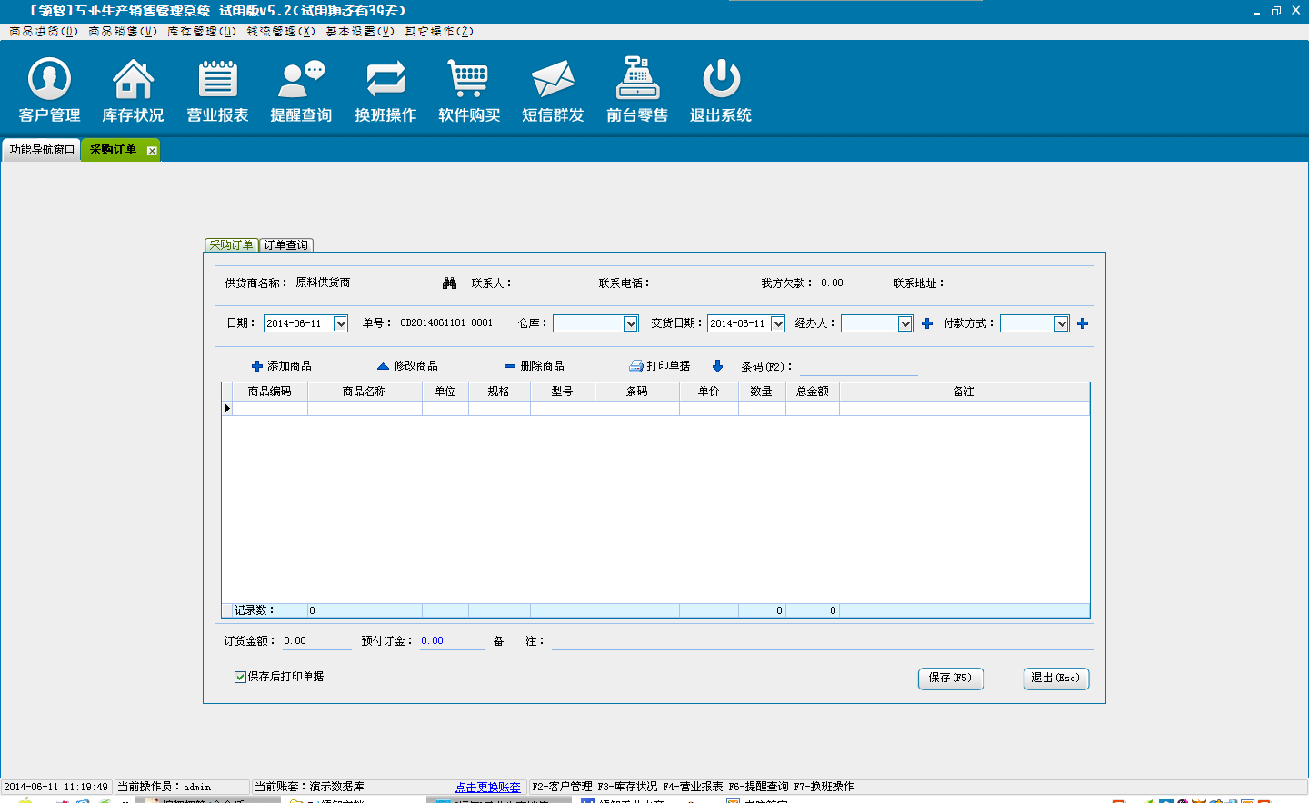 采购订单是对商品采购订单单据的录入。采购订单单据形成后并不会影响商品库存,可在订单查询中查询订单信息,单击订单查询中的订单入库,可将订单信息加载到商品采购入库界面,保存单据就可以将订单单据转为采购入库单据。