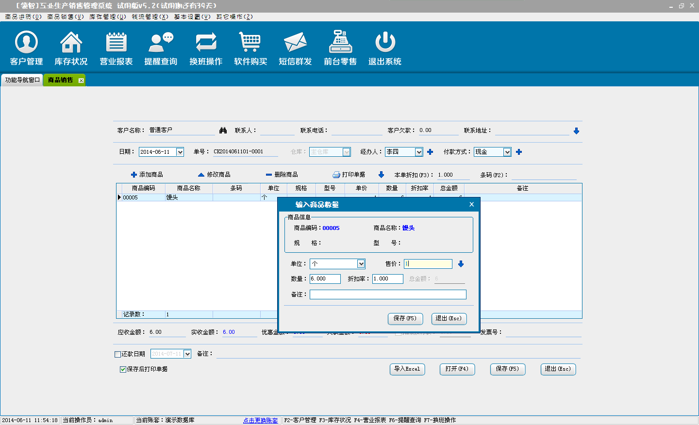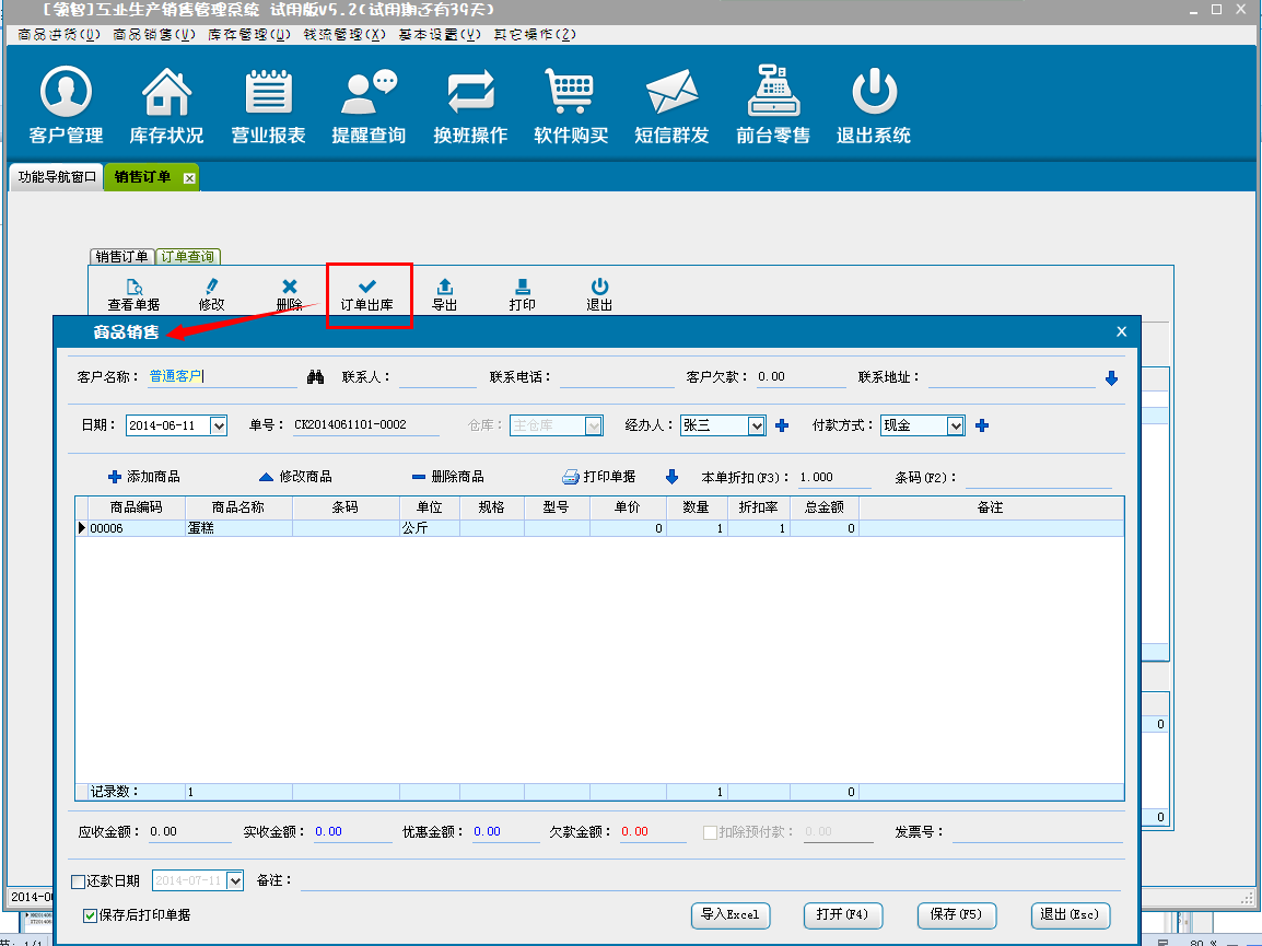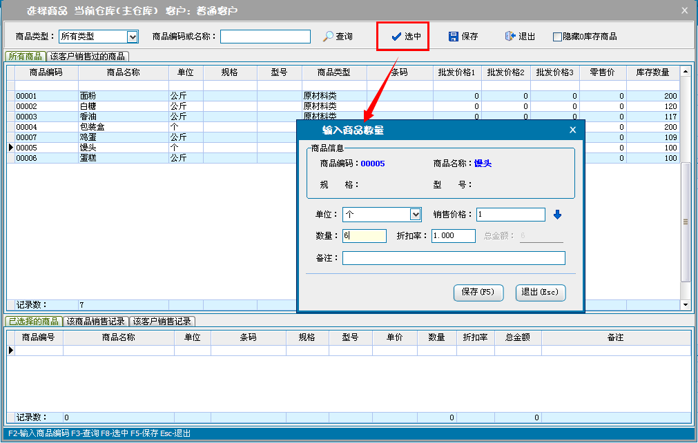 b:核对销售商品信息,可对添加的商品直接修改数量、单价和折扣率(折扣率为大于0小于等于1的小数,0.8即8折)。
