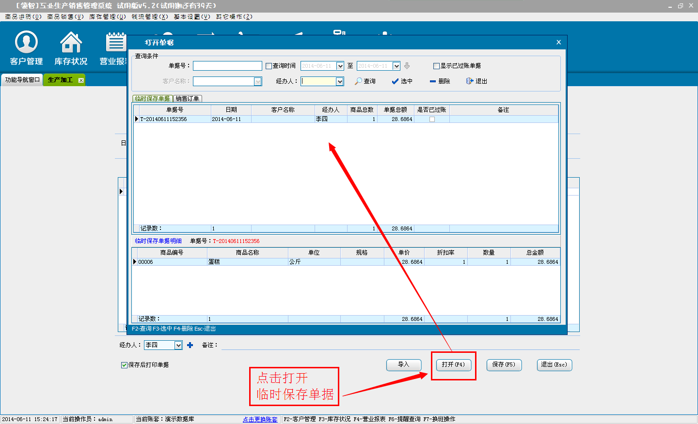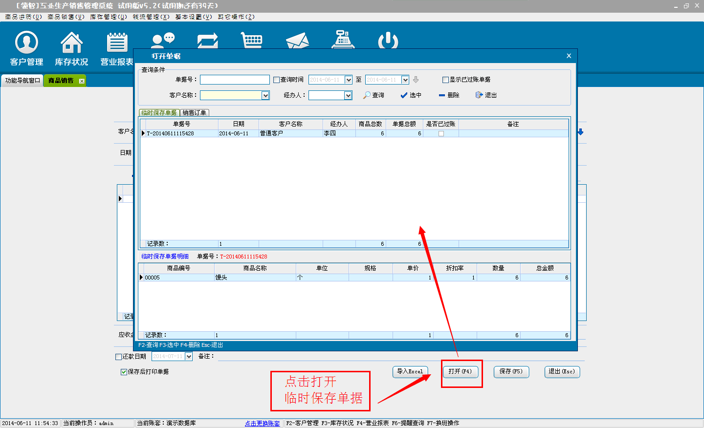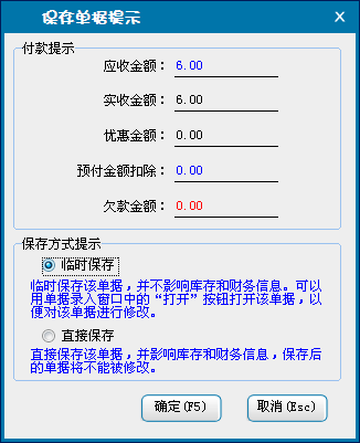 d:选择临时保存,单击确定后,单据将保存为临时商品销售单,不会对商品的库存和财务信息产生影响。临时单据可以在商品销售窗口单击“打开”按钮,在打开单据中选择临时保存单据进行打开。