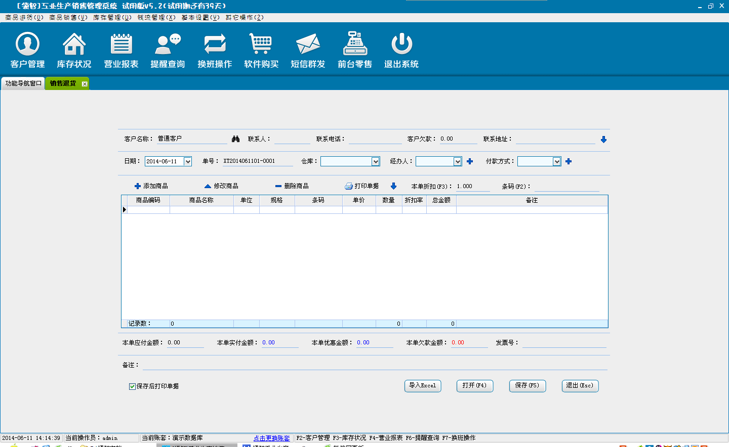 选择商品销售模块中的销售退货进入销售退货功能界面。