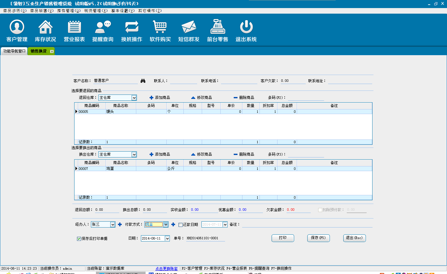 销售换货是对销售的商品和仓库中的商品进行换货操作,实际就是包含商品退货入库和商品销售出库两个过程。选择商品换货入库的仓库,选择被换商品信息,选择换货商品的出库仓库,选择换货商品,确认商品信息和实退金额信息,保存完成商品换货操作。