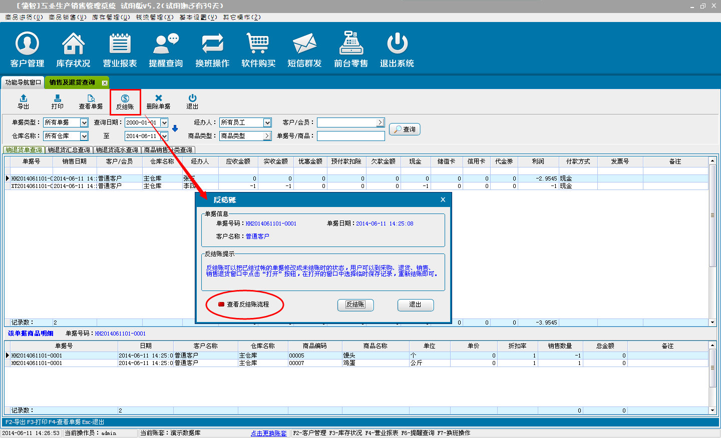 用于查询商品的商品销售、退货单据(含批发销售单和POS端零售单据)、销退货汇总查询。销退货流水查询(即销退货商品明细查询)和销退货按商品类别汇总统计。选择单据,单击查看单据可查询该单据的商品明细信息。单击反结账对该单据进行反结账操作(反结账后的单据可在商品销售或销售退货窗口中,通过打开单据打开并进行再次结账处理)