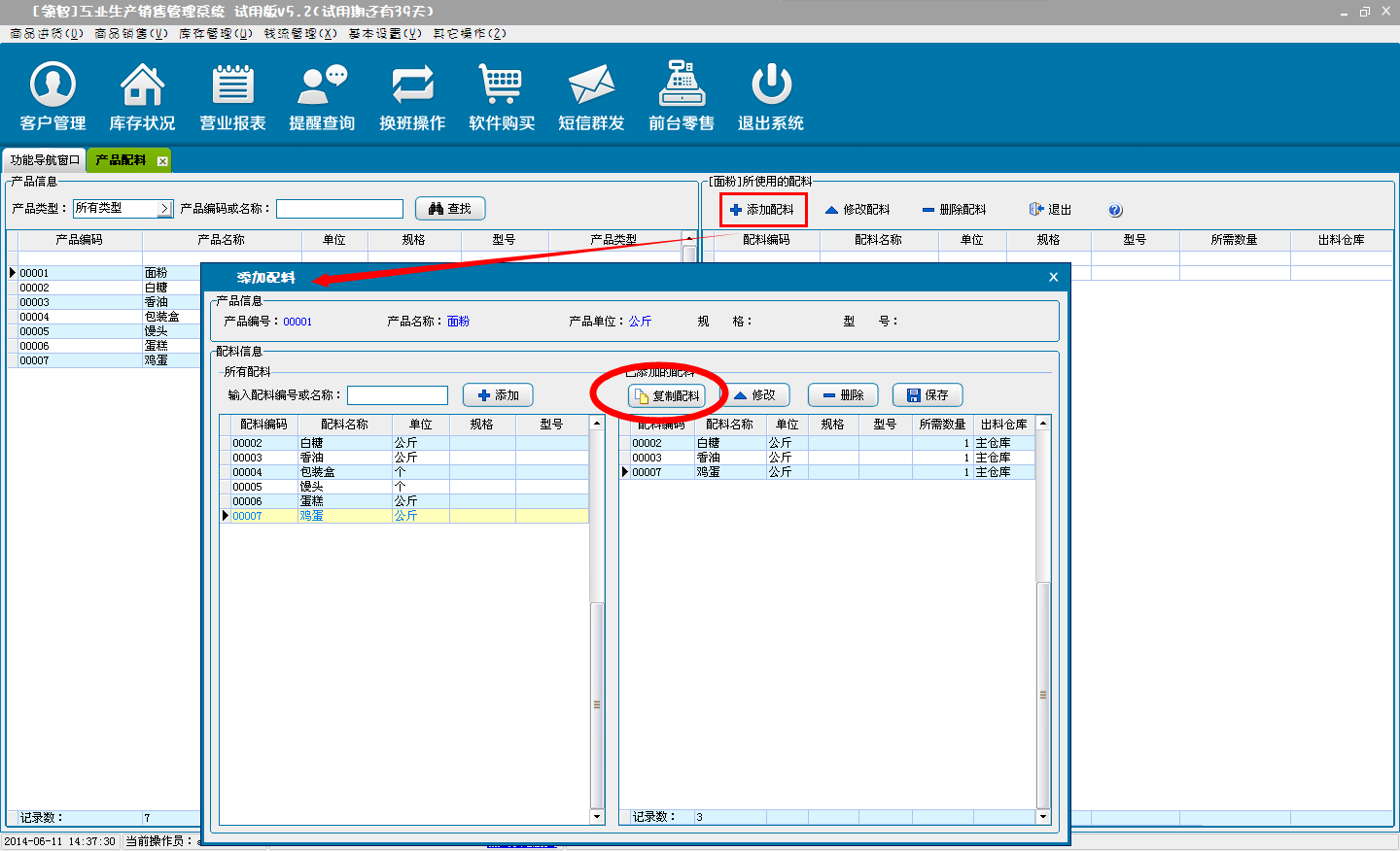 添加生产用的配料,并支持复制配料的功能。