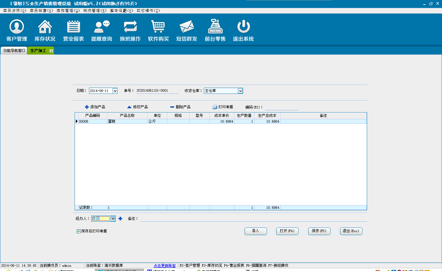 e:选择直接保存,单击确定后,单据将直接保存为正式的生产加工单,并对应更新相关仓库中的商品库存信息,。
