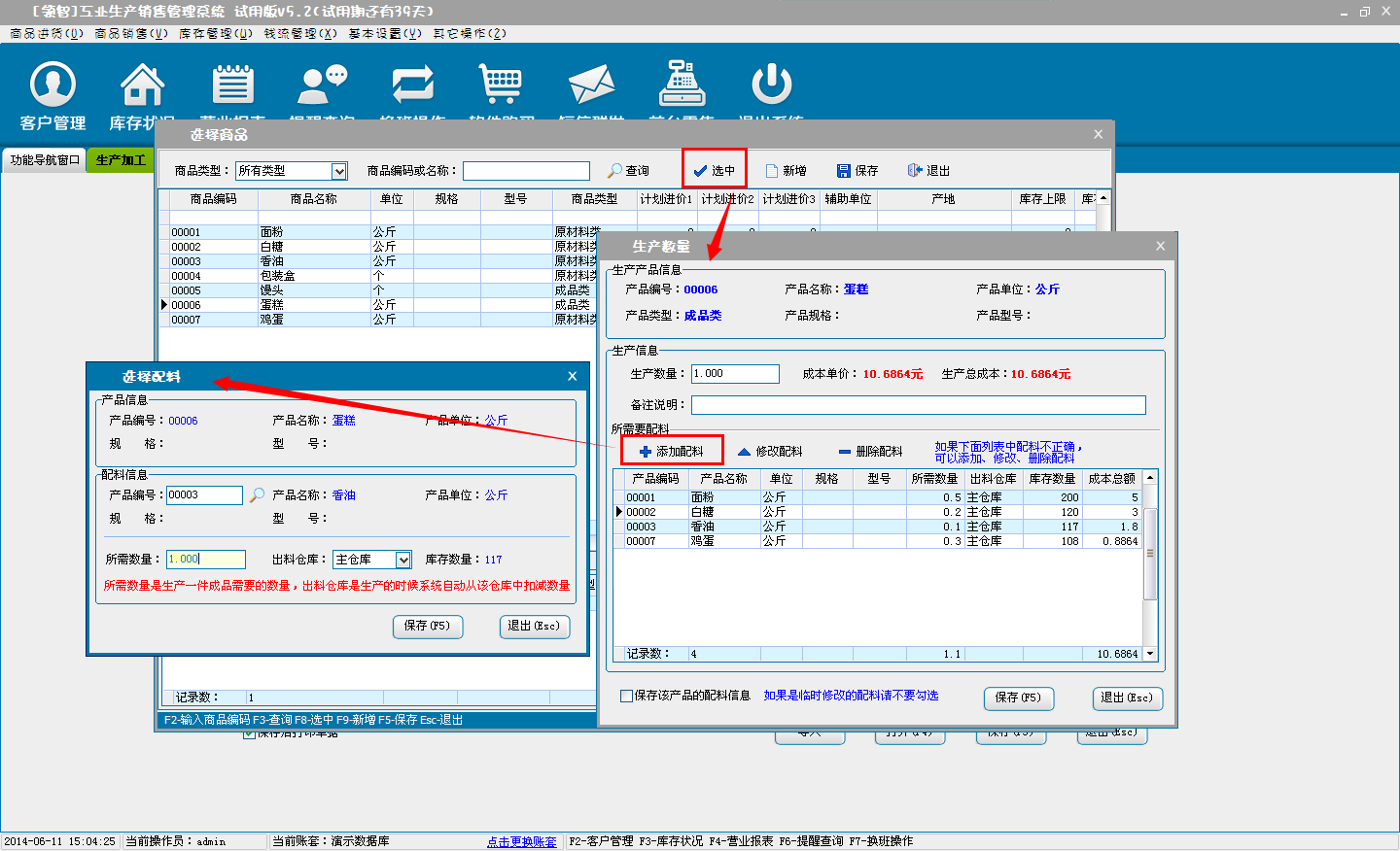 a.单击添加产品,进入选择产品窗口,添加产品配料信息。设置配料的数量,单击保存退出,返回选择产品界面。
