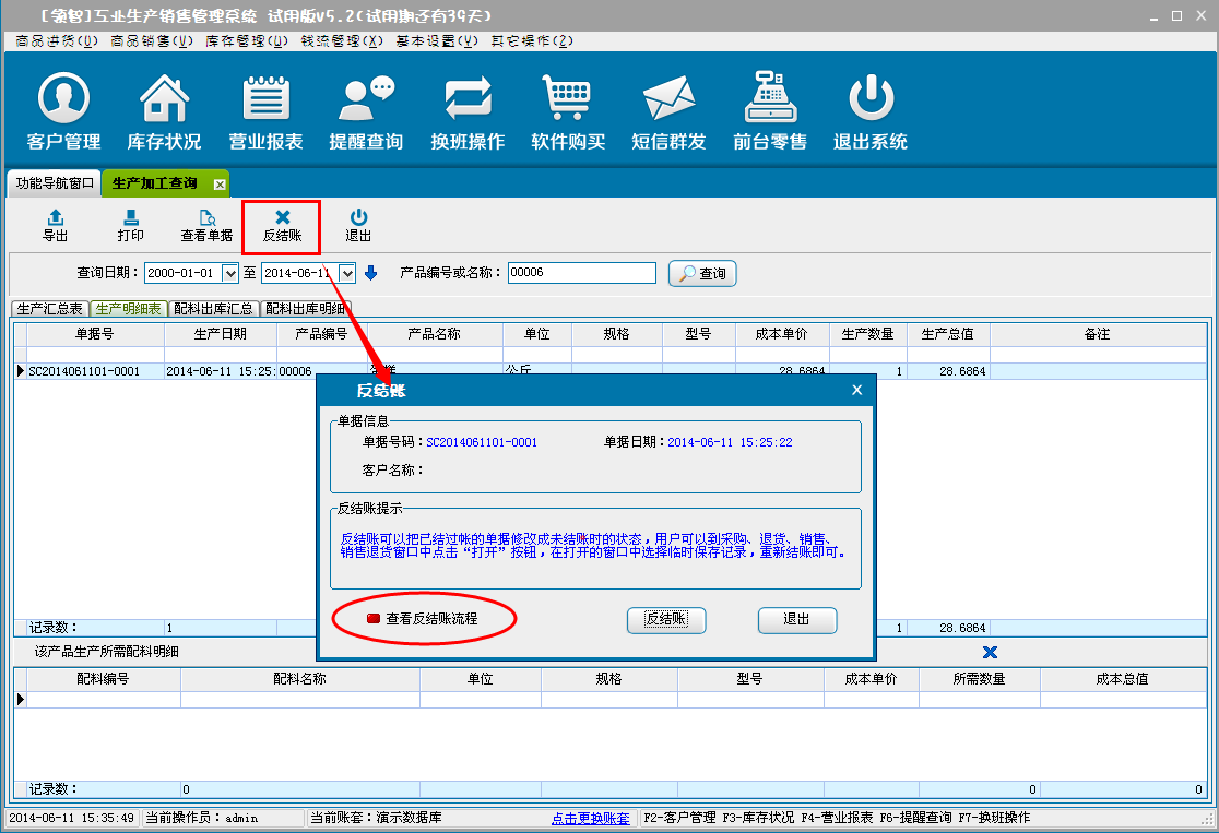 生产汇总、明细,配料出库汇总、明细。支持单据反结账。