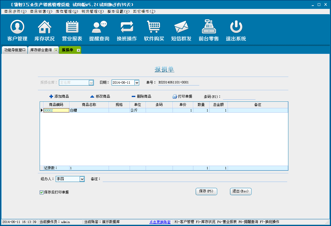 商品报损单的录入,选择报损仓库,添加报损的商品后保存形成报损单,商品对应的库存信息会进行扣减。报损单据可在报损报溢查询中统计查询。