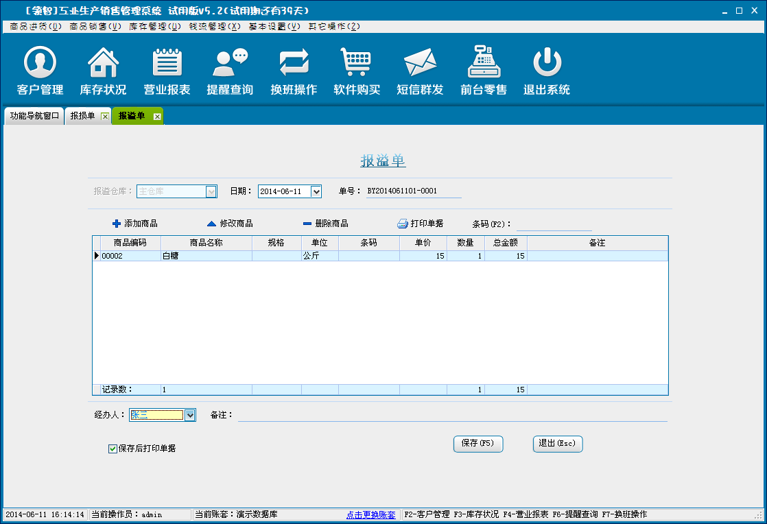 商品报溢单的录入,选择报溢仓库,添加报溢的商品后保存形成报溢单,商品对应的库存信息会进行增加。报溢单据可在报损报溢查询中统计查询。