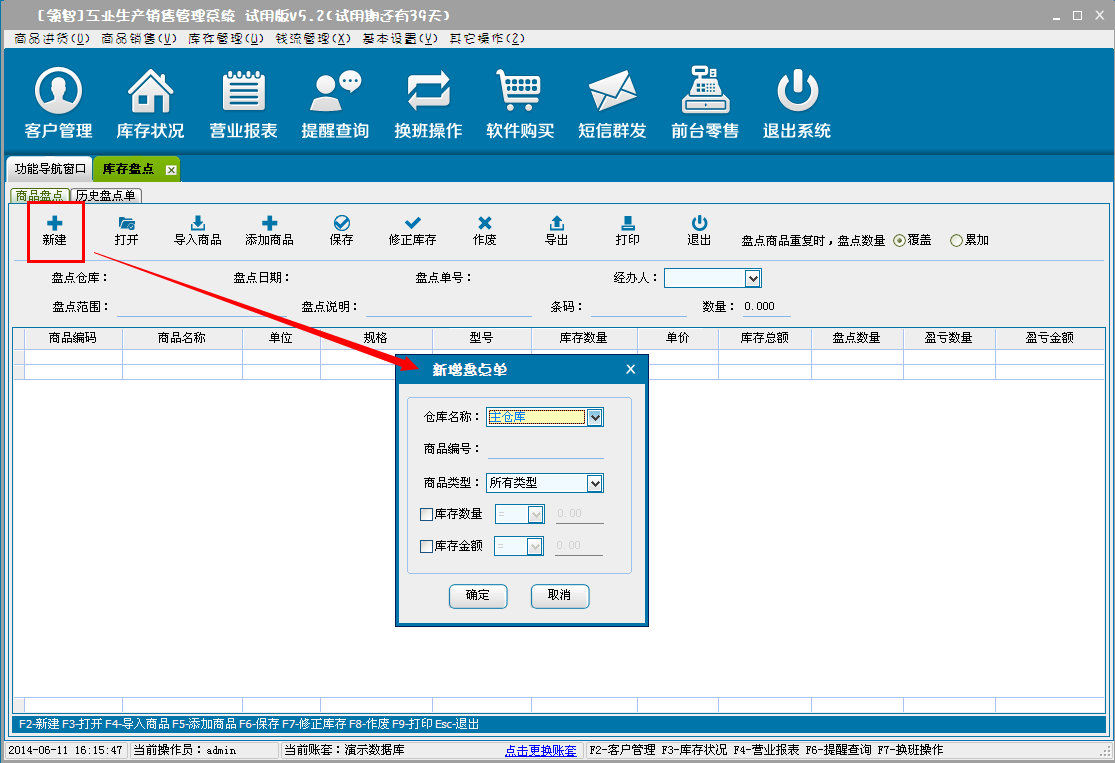 a:单击新建建立盘点单,可以选择指定的条件,单击确定建立盘点单。也可以建立空盘点单,然后通过导入商品货添加商品建立盘点单。