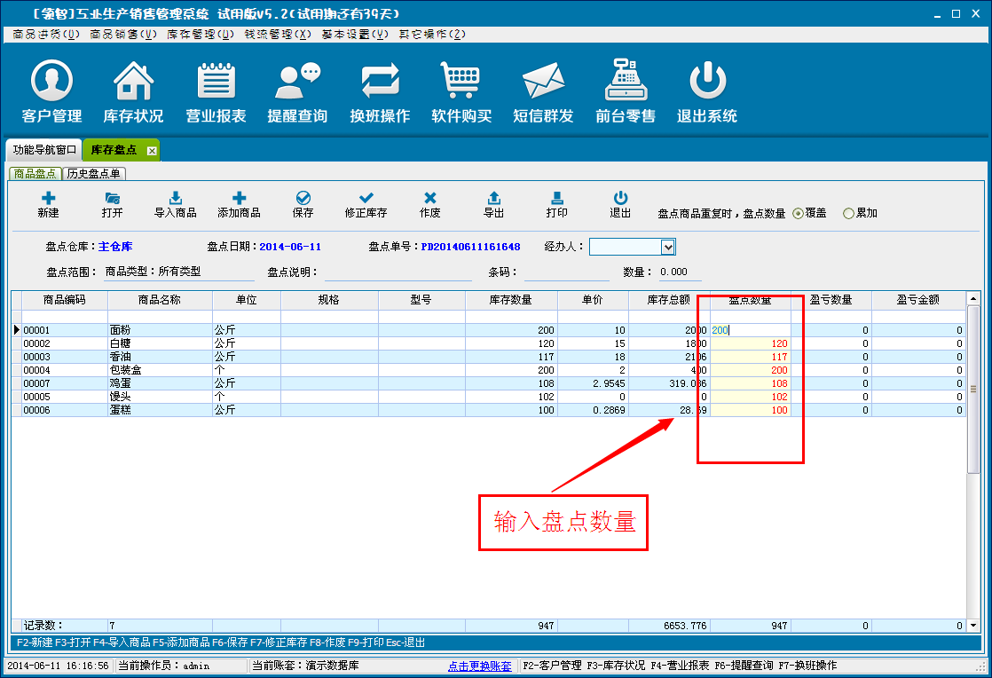b:建立盘点单后,在盘点数量处输入盘点商品的盘点数量,产生盈亏金额和数量。单击作废取消本次盘点。