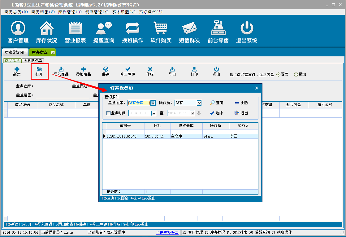 c:保存盘点单,单击保存即可保存盘点单,此时并没有更新商品库存的库存信息,只是把盘点单据进行了保存。保存的盘点单可点击打开,选择打开保存过的盘点单。