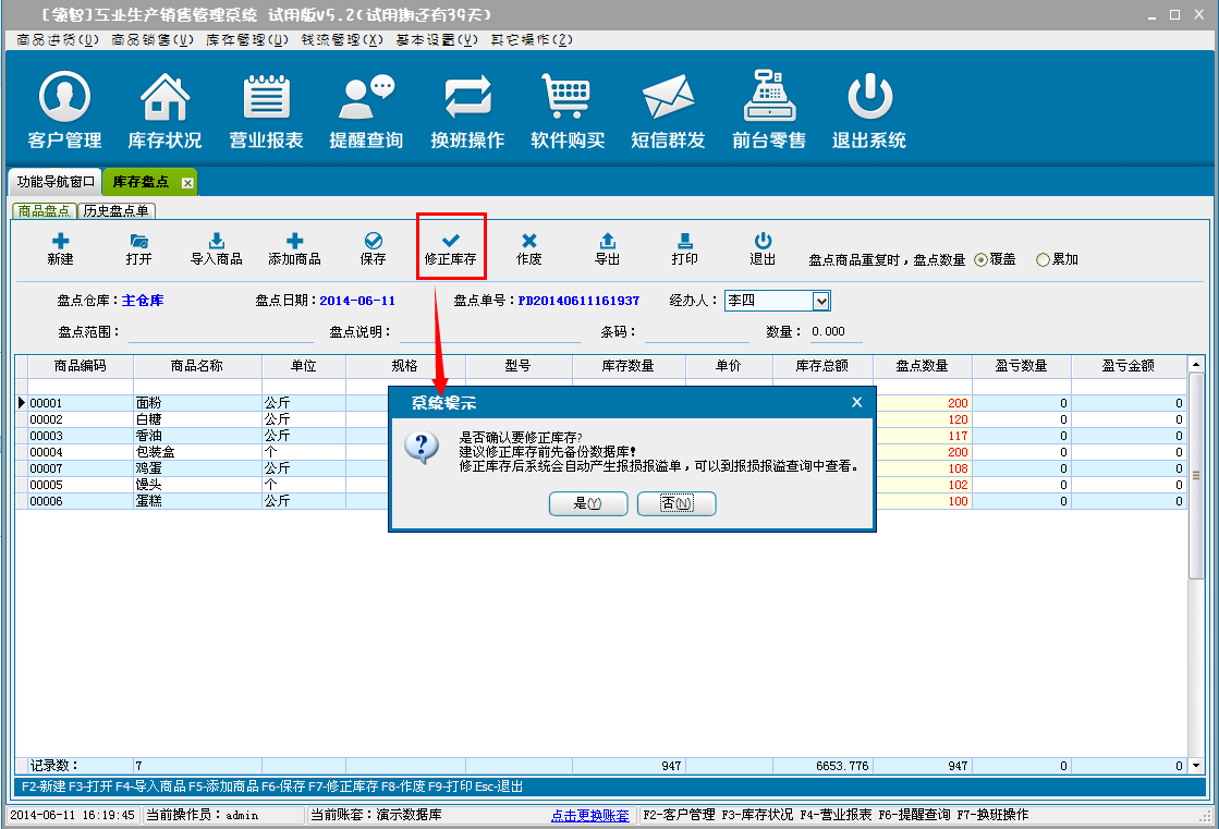 d:单击修正库存可以按当前商品的盘点数量对商品的库存数量进行修正,此时会根据盘点数量产生对应的商品报损报溢单据。请注意提示信息,单击是修正库存,单击否返回。