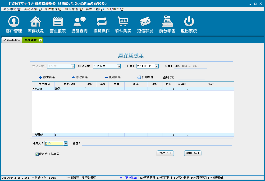 库存调拨是将商品从一个仓库中调到另一个仓库的过程。选择发货仓库和收货仓库(两个仓库不能相同),添加调拨的商品信息,保存形成商品调拨单。可在商品调拨查询中查询调拨单据。