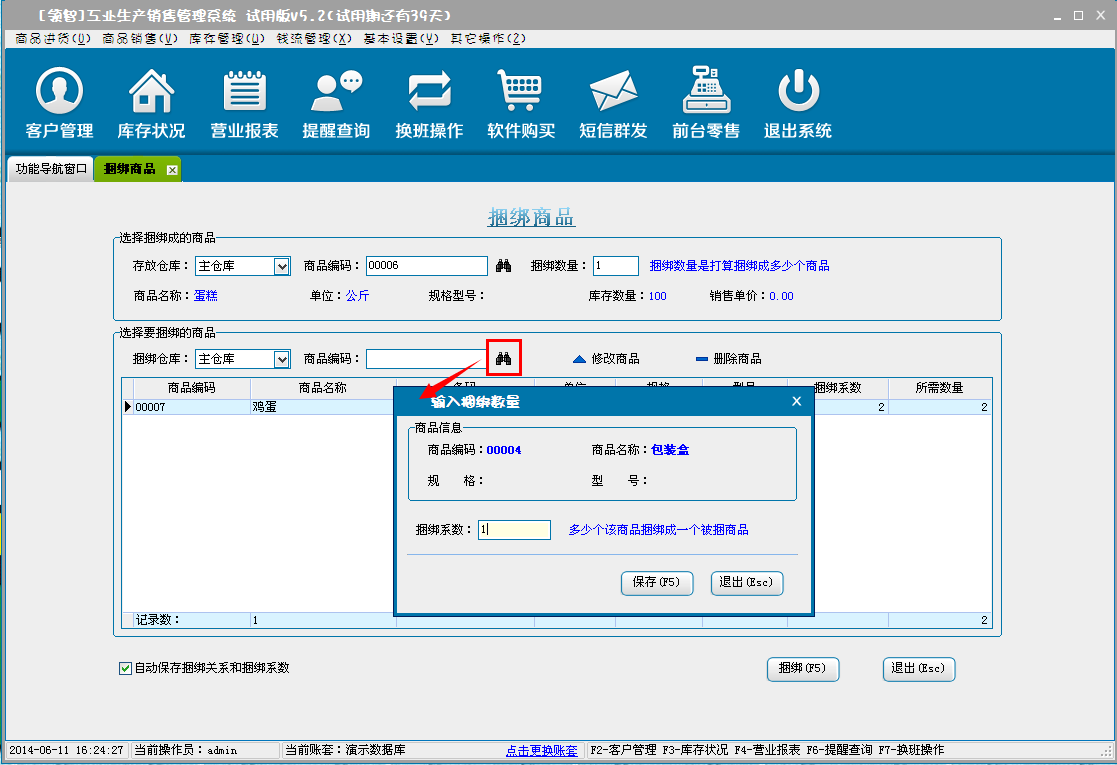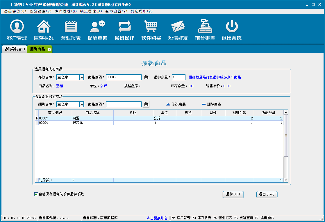 b:选择捆绑的仓库,选择被捆绑的商品,输入捆绑系统,保存。