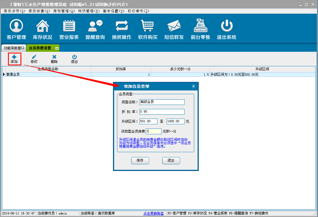增加、修改、删除会员的类型,对会员类型名称、折扣率(折扣率为大于0小于等于1的小数,0.8即8折)、升级区间以及积分进行设置。
