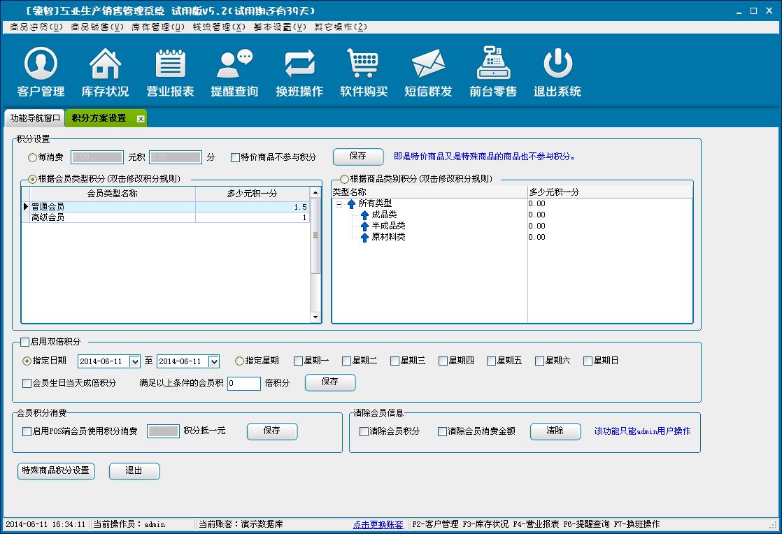 会员积分方案是对会员积分进行设置。可以按照消费金额、会员类型、指定日期、特殊商品进行积分。以及会员积分消费和清除会员信息。