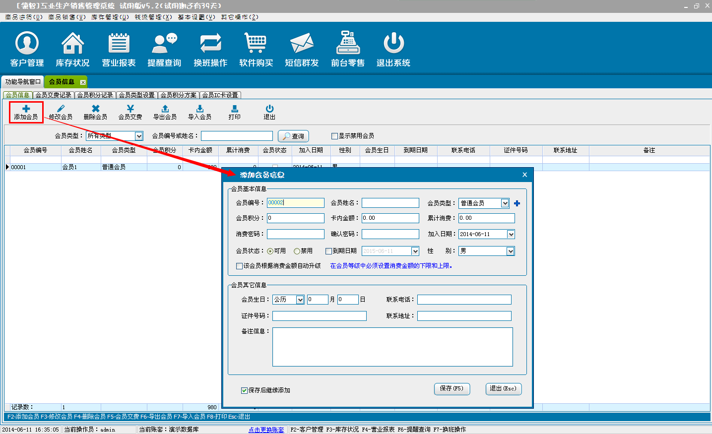 录入会员的基本信息,支持增加增加、修改、删除、excel电子表格导入、导出会员的基本信息,以及会员缴费。
