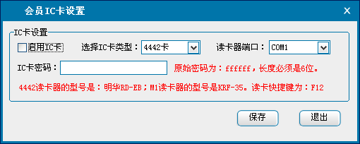 会员Ic卡设置中可以设置Ic卡的类型以及读卡器端口。4442读卡器的型号是:明华Rd-eb:M1读卡器的型号是KRf-35。