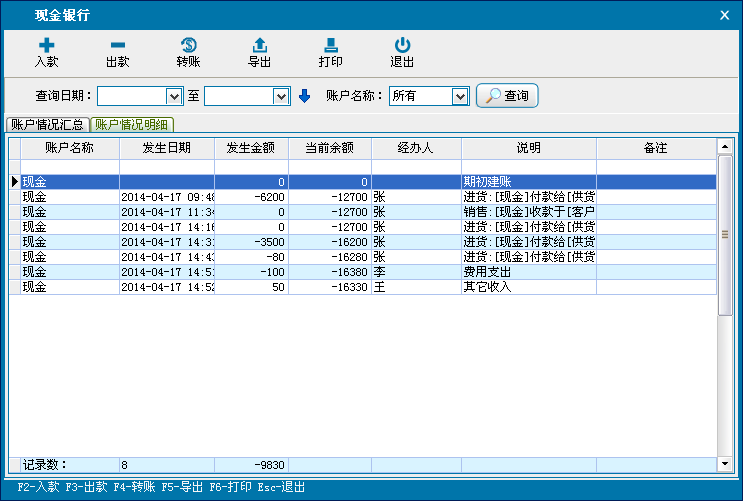 现金银行是对公司财务账户的管理、统计。可进行入款、出款转账操作。