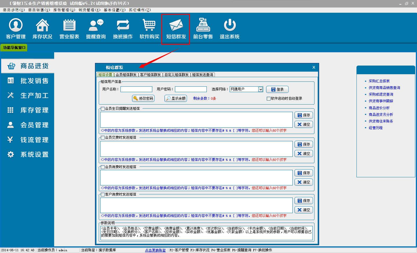 短信群发设置。可自定义会员生日短信提醒、会员交费发送短信、会员消费发送短信、客户消费时发送短信的内容,系统提供一部分参数信息,用户可以设定在短信内容里,发短信时候系统会自动显示参数信息。此外,还可以对指定会员、指定客户和自定义手机号码群发短信。注:短信账务的注册可以联系公司销售进行咨询。