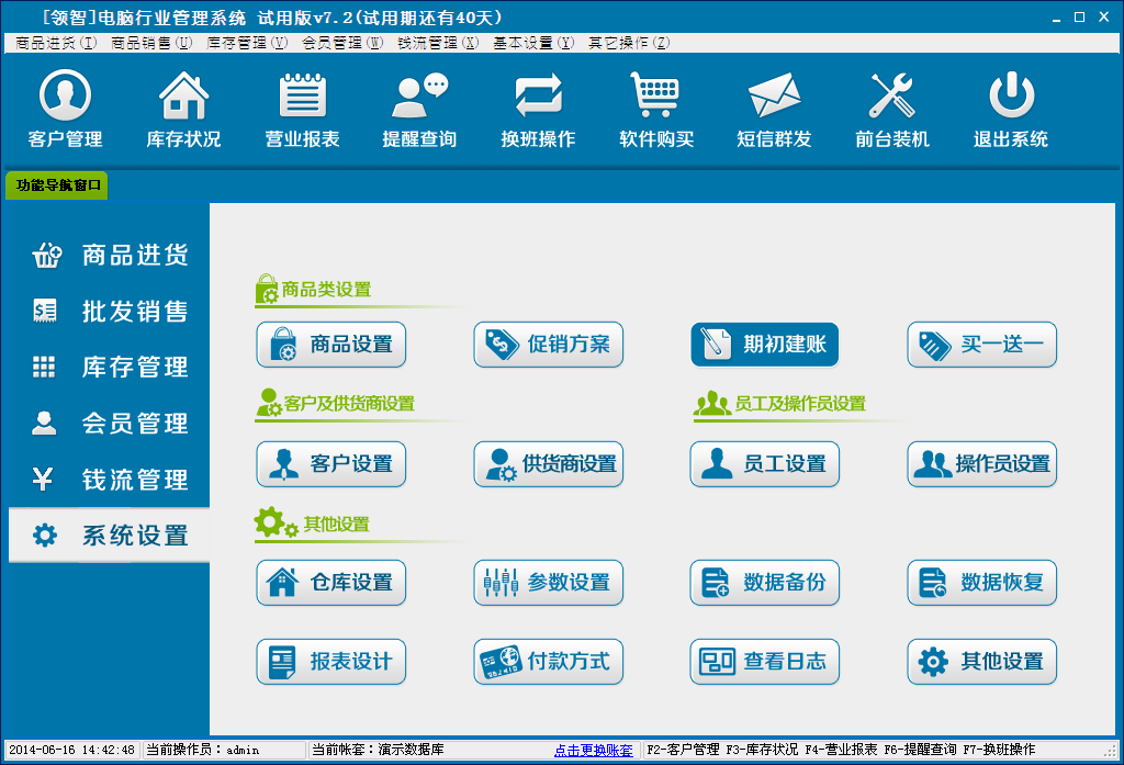 系统设置包含商品设置、客户设置、供货商设置、员工设置、操作员设置、仓库设置、数据库备份、恢复和其它设置等几个部分,用于设置系统的基础数据信息和系统功能相关的参数。
