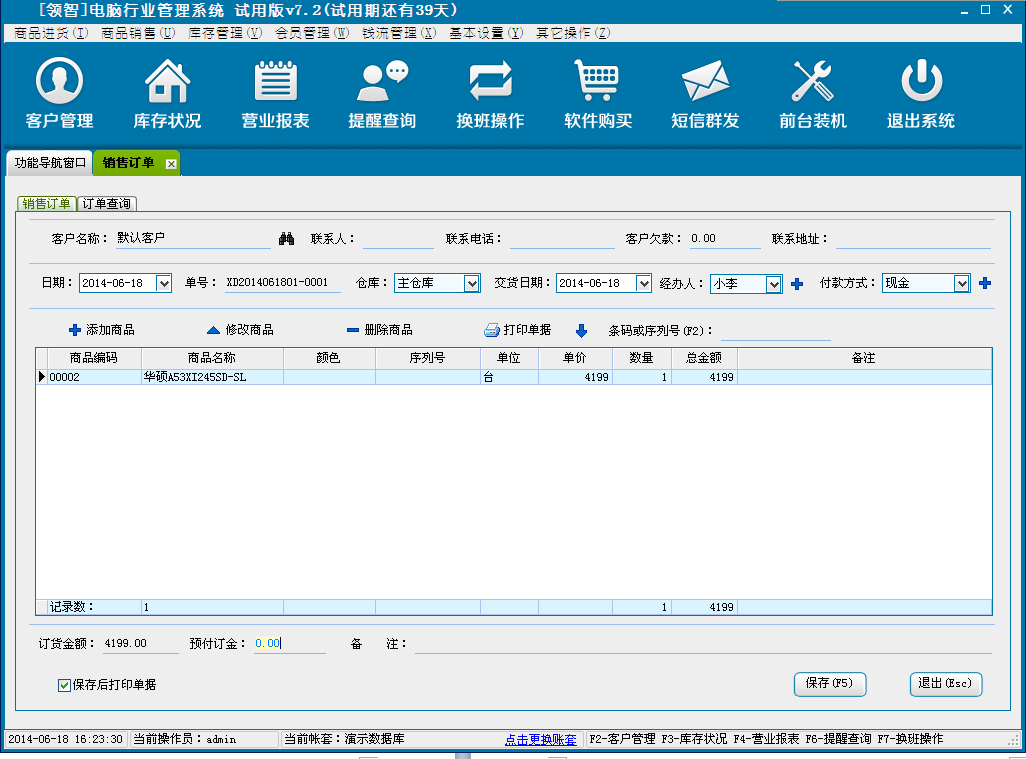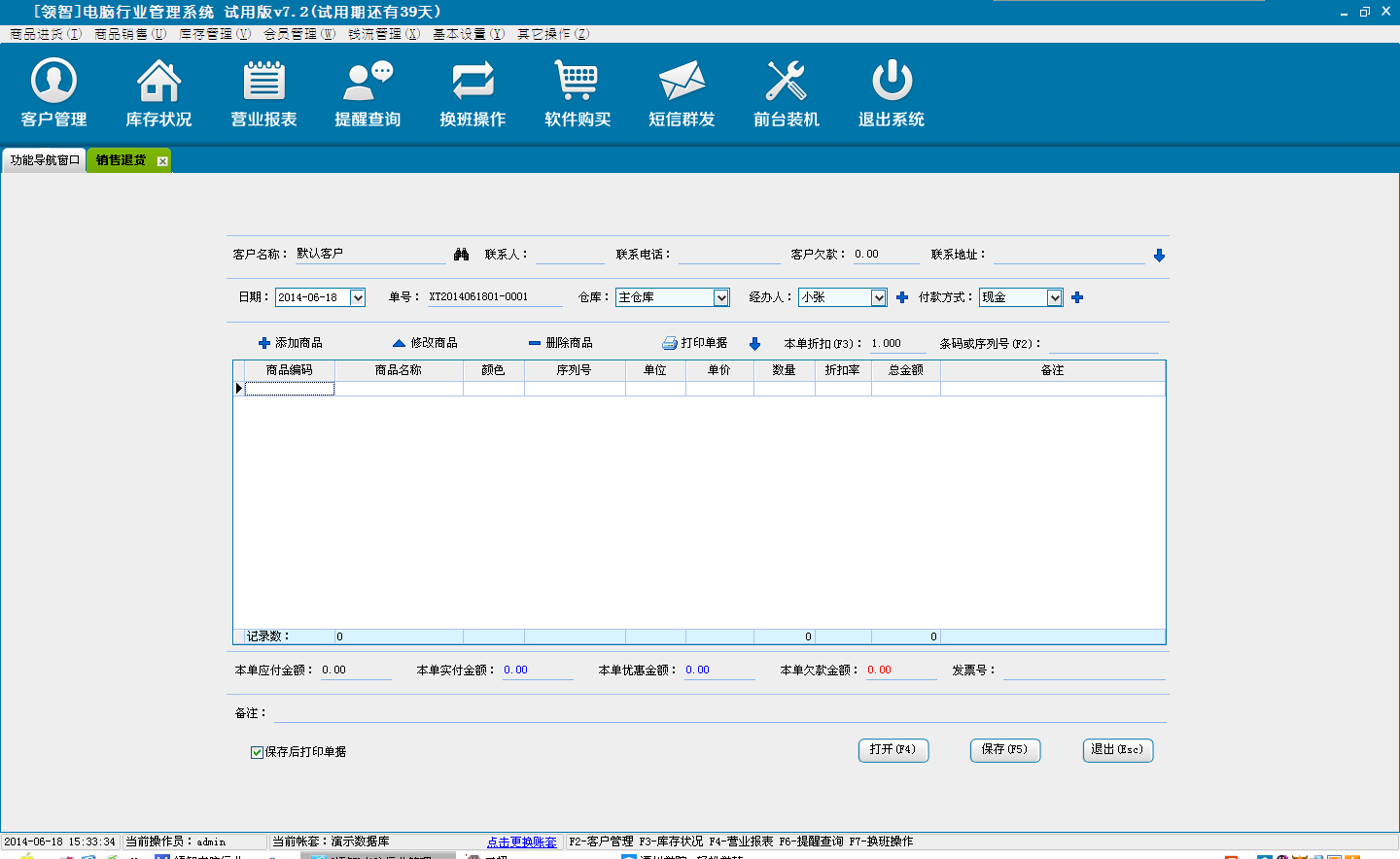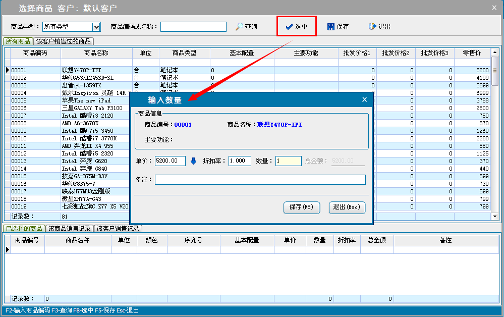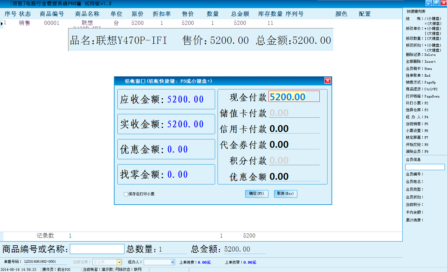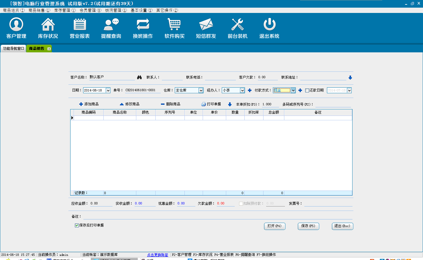 打开领智电脑行业POS销售程序,可以根据右侧的快捷键帮助列表执行各种操作。
