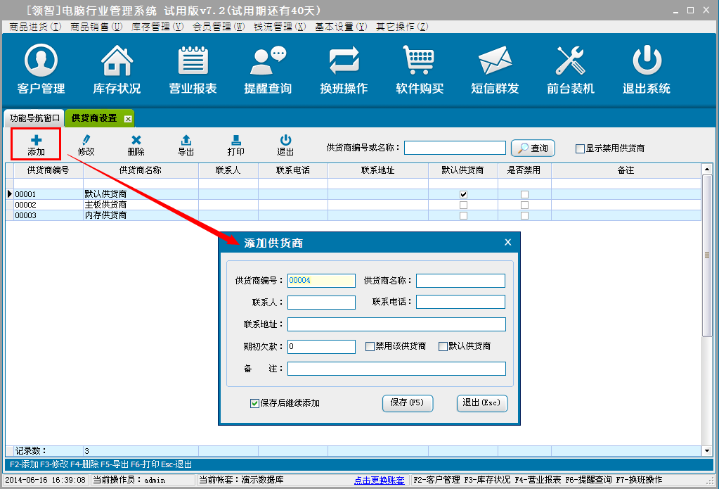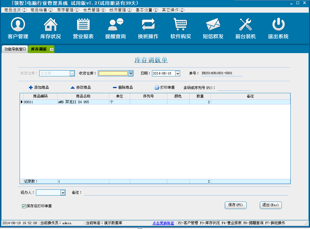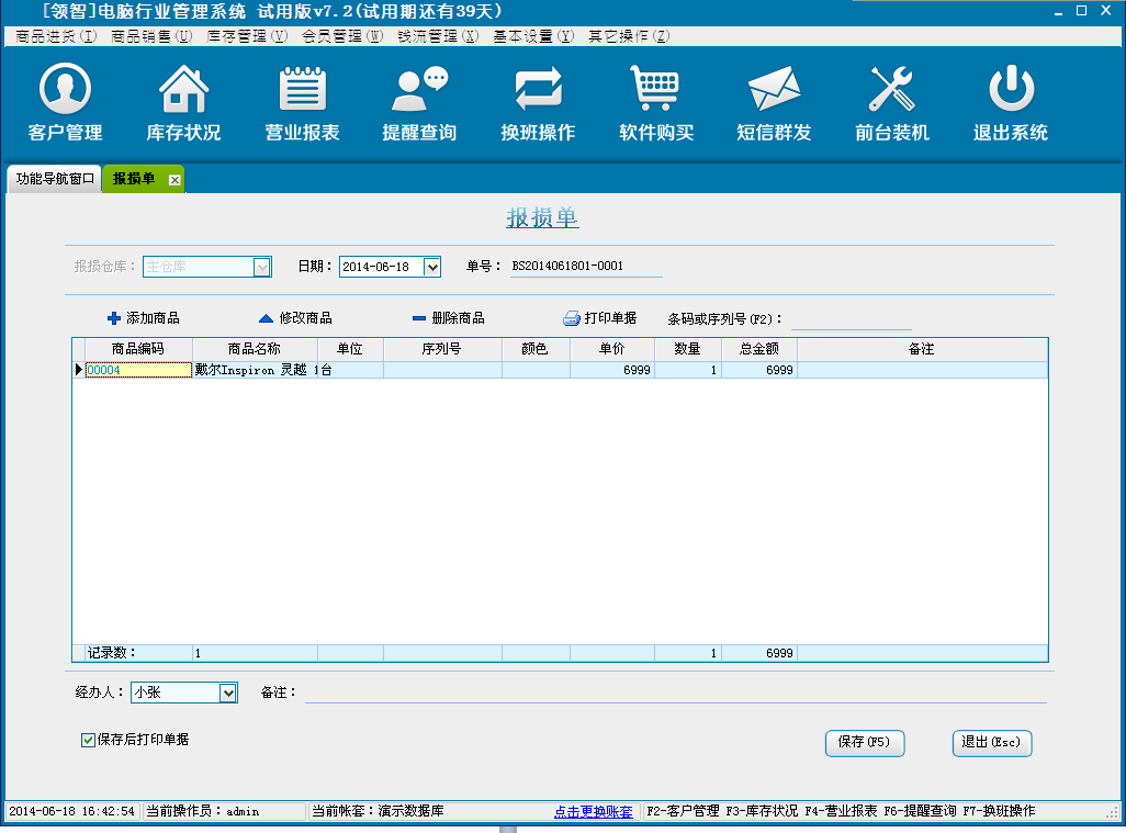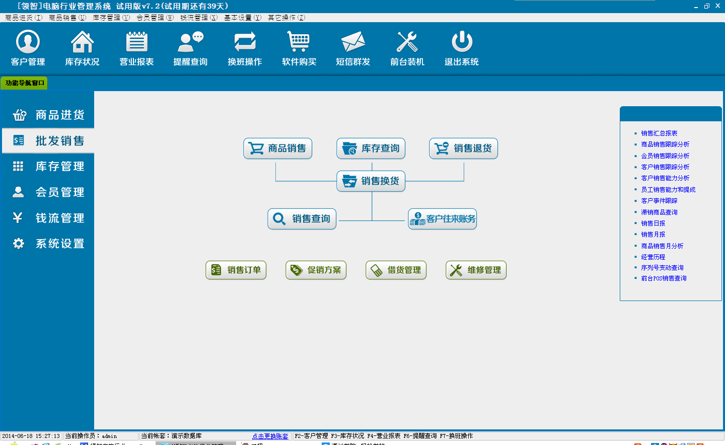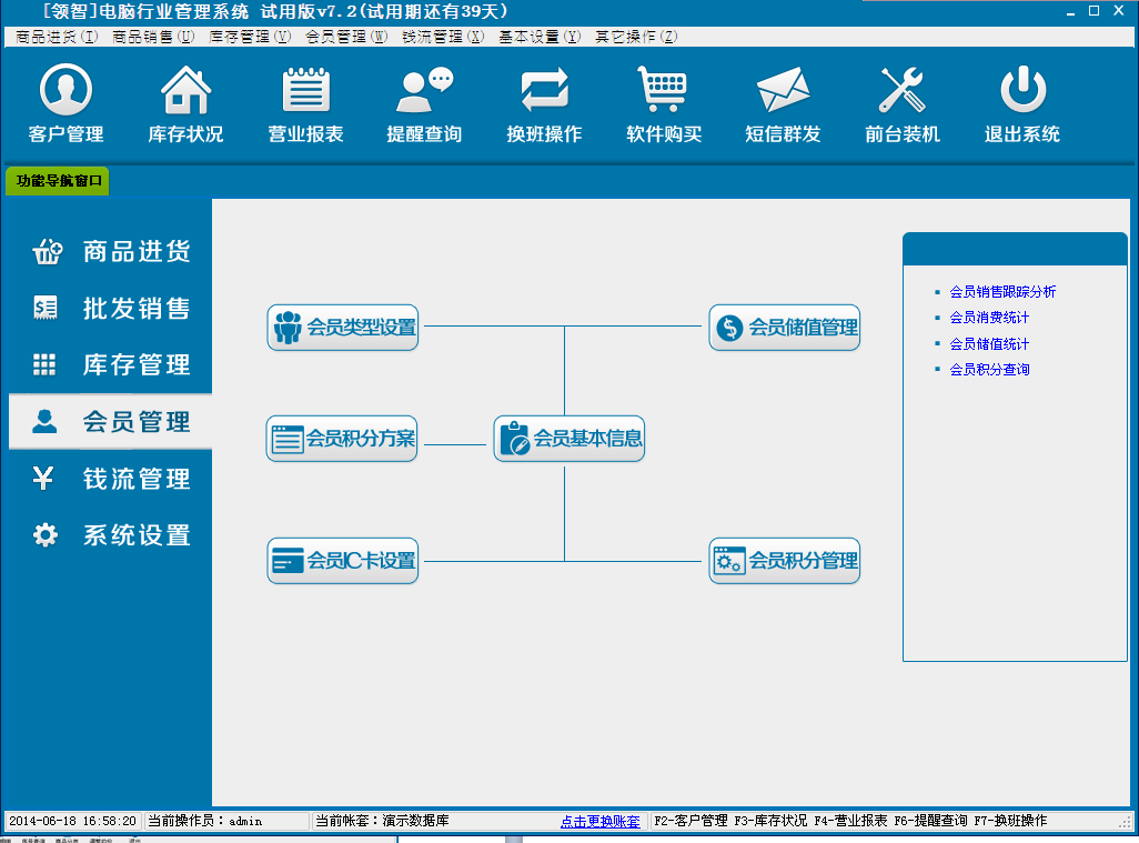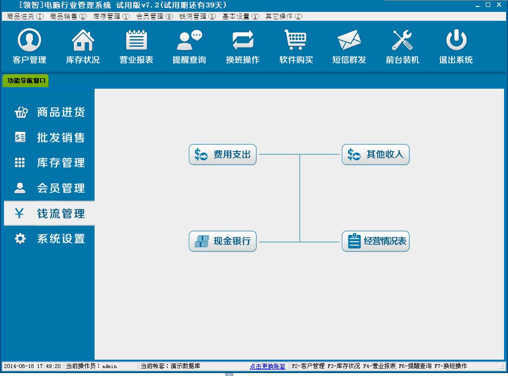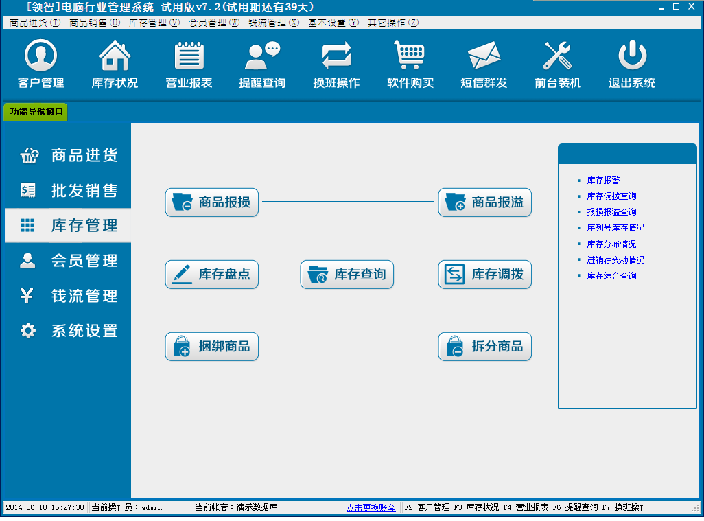 领智软件包含商品进货、批发销售、库存管理、会员管理、钱流管理、系统设置几个主要功能模块。