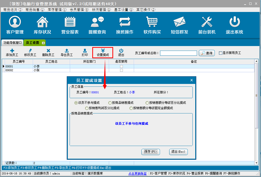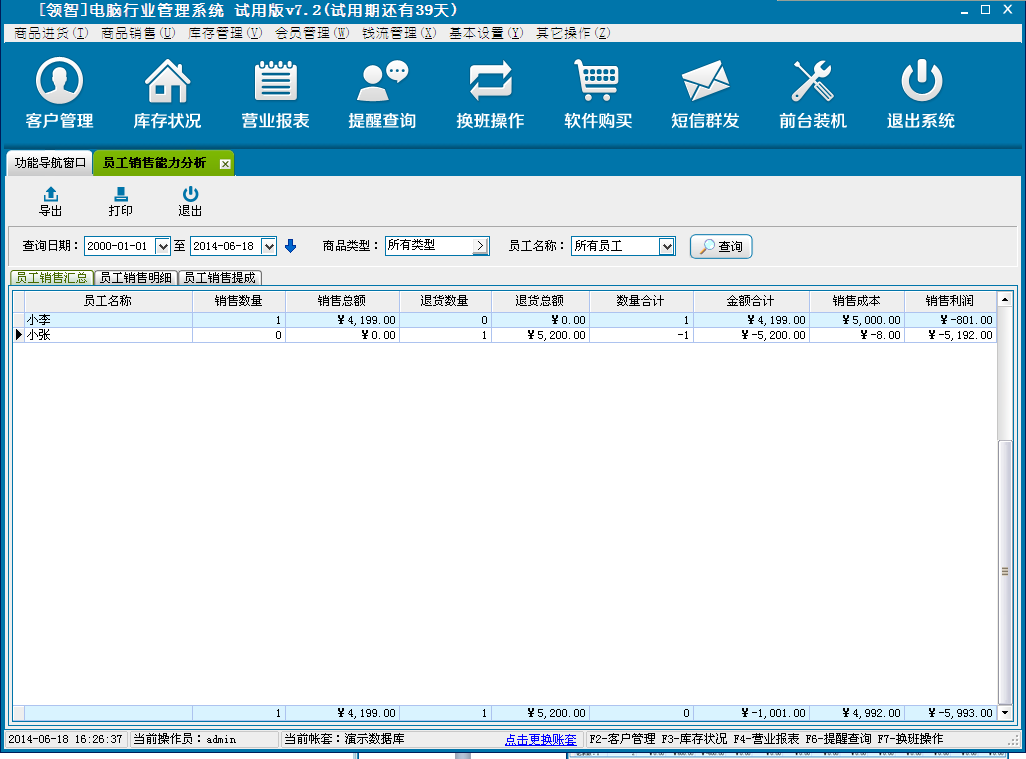 员工销售业绩和提成的统计。需要设置员工提成方案和商品提成方案,产生商品销售操作后该功能才有效。
