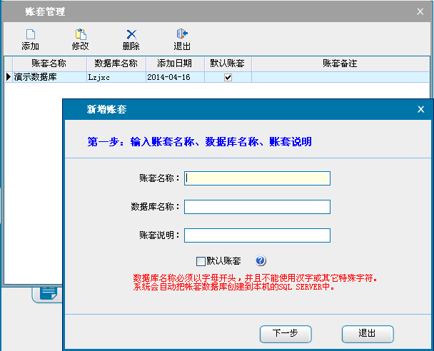 可以建立新的帐套数据库,用于增加、删除、更换帐套。