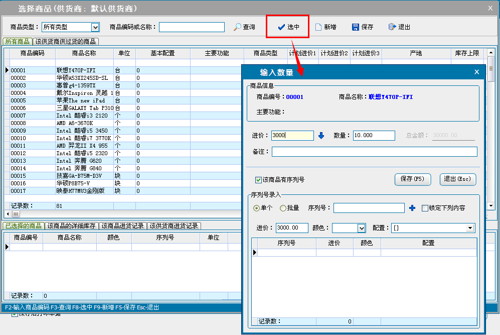 单击添加商品,进入选择商品窗口,添加采购商品信息。设置商品的采购价格,数量和折扣率,单击保存退出,返回采购进货界面。也可以单击导入excel通过excel文档导入采购的商品信息。