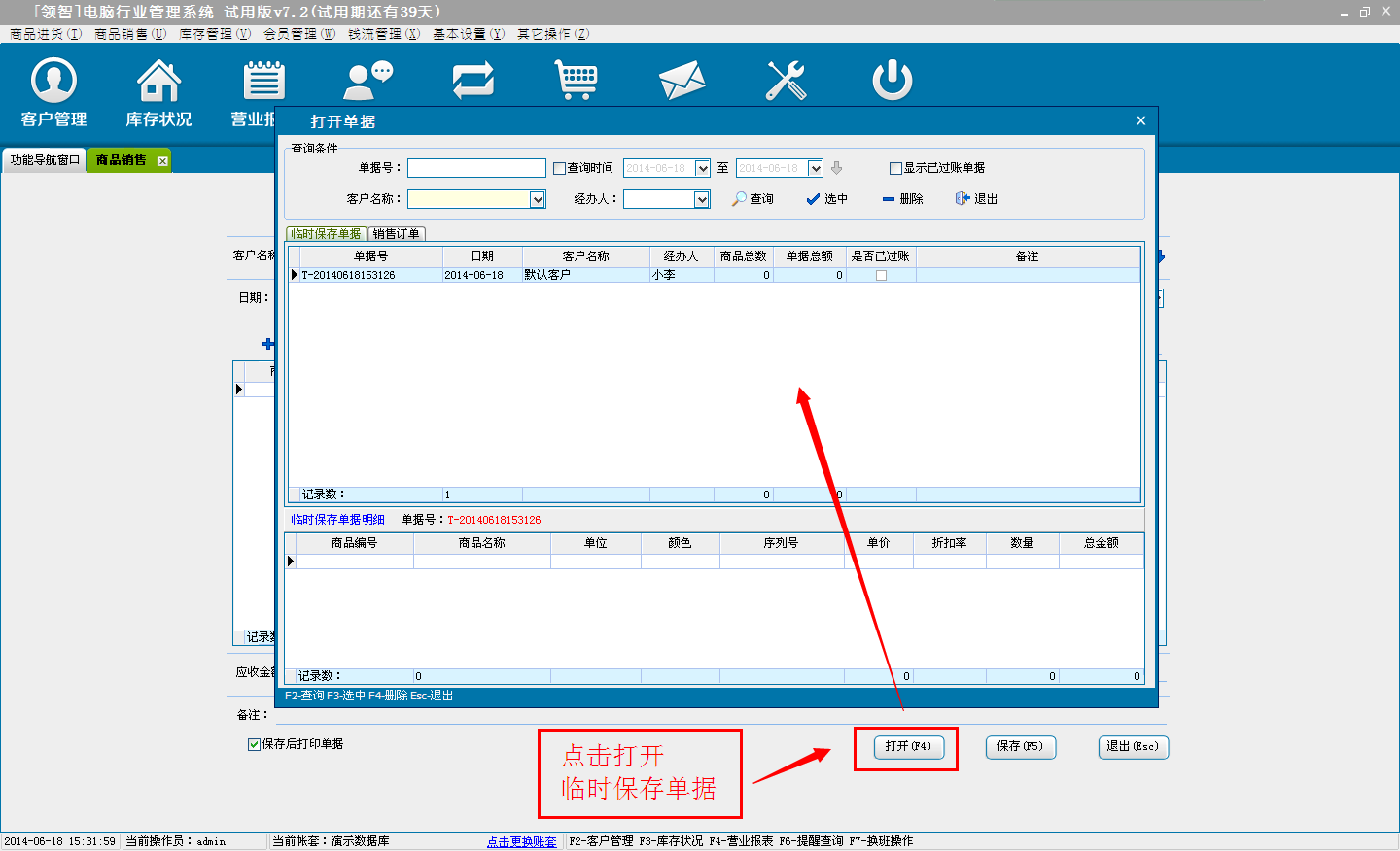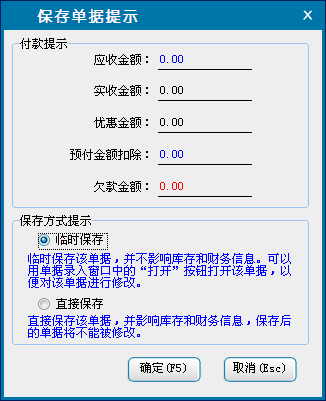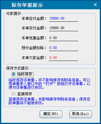 d:选择临时保存,单击确定后,单据将保存为临时商品销售单,不会对商品的库存和财务信息产生影响。临时单据可以在商品销售窗口单击“打开”按钮,在打开单据中选择临时保存单据进行打开。